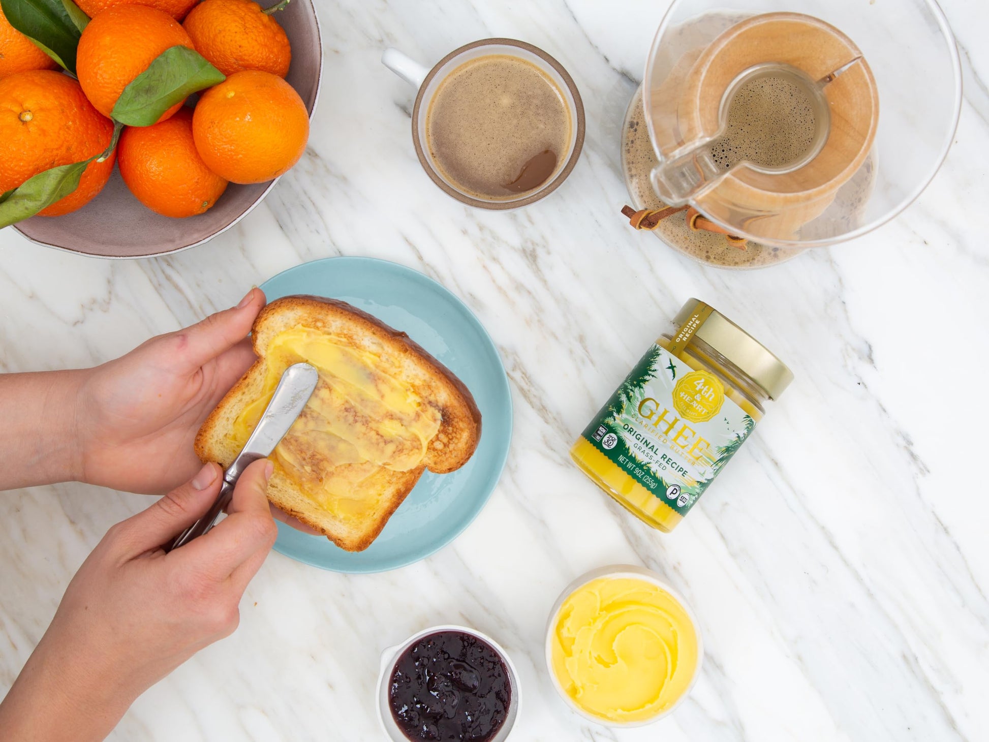 Q: What is ghee and how is it different from regular butter?A: Ghee is a type of clarified butter that is made by simmering butter to remove water and milk solids, resulting in a rich, nutty flavor. Unlike regular butter, ghee is lactose and casein free, making it suitable for those with dairy sensitivities.