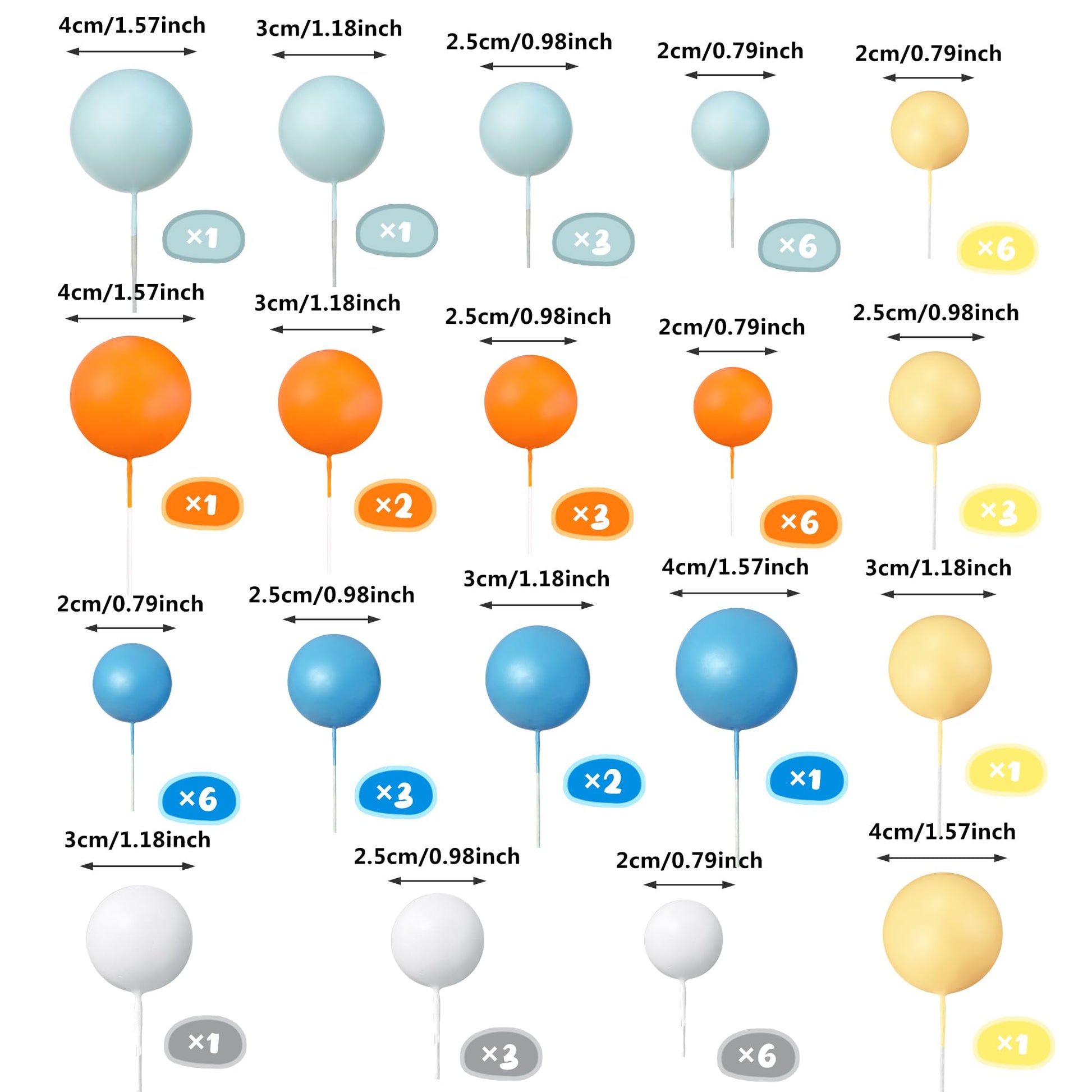 Features And Purposes Add Some Fun To Your Cake With Our Colorful Ball Shaped Cake Topper! These Ball Decorations For Cake Are The Perfect Addition To Any Celebration. Made Of High-Quality Materials, These Mini Balls Cake Topper Are Sturdy And Easy To Use. Simply Push Them Onto Your Cake And They Will Stand Upright, Adding A Playful Touch To Your Dessert. These Ball Cake Toppers Are Sure To Make Your Cake Stand Out And Impress Your Guests. So Why Wait? Add Some Fun And Color To Your Cake With Our Balls Cake Topper Set Today! Specification Size- The Ball Cake Topper Has 4 Sizes, Including 0.79 Inch, 0.98 Inch, 1.18 Inch And 1.57 Inch. Material- Foam And Latex Wire. Color- Orange, Yellow, Dark Blue, Light Blue, White. Package Includes Each Package Comes With 56 Pcs Of Ball Cake Toppers In Orange, Yellow, Dark Blue, Light Blue And White Colors.