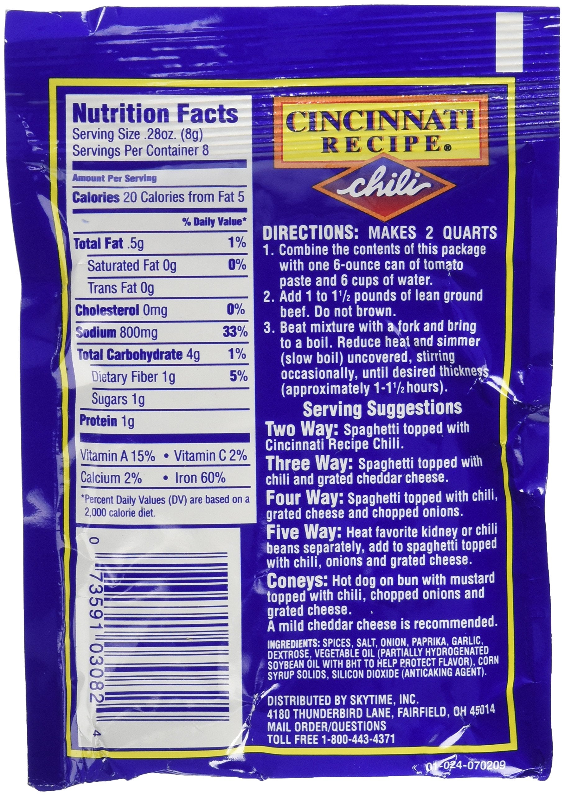 Q: How do I prepare Cincinnati chili using these mix packets?A: To prepare Cincinnati chili, simply follow the instructions on the packet. Typically, you will need to combine the mix with ground meat, water, and other ingredients, then simmer until the flavors meld.