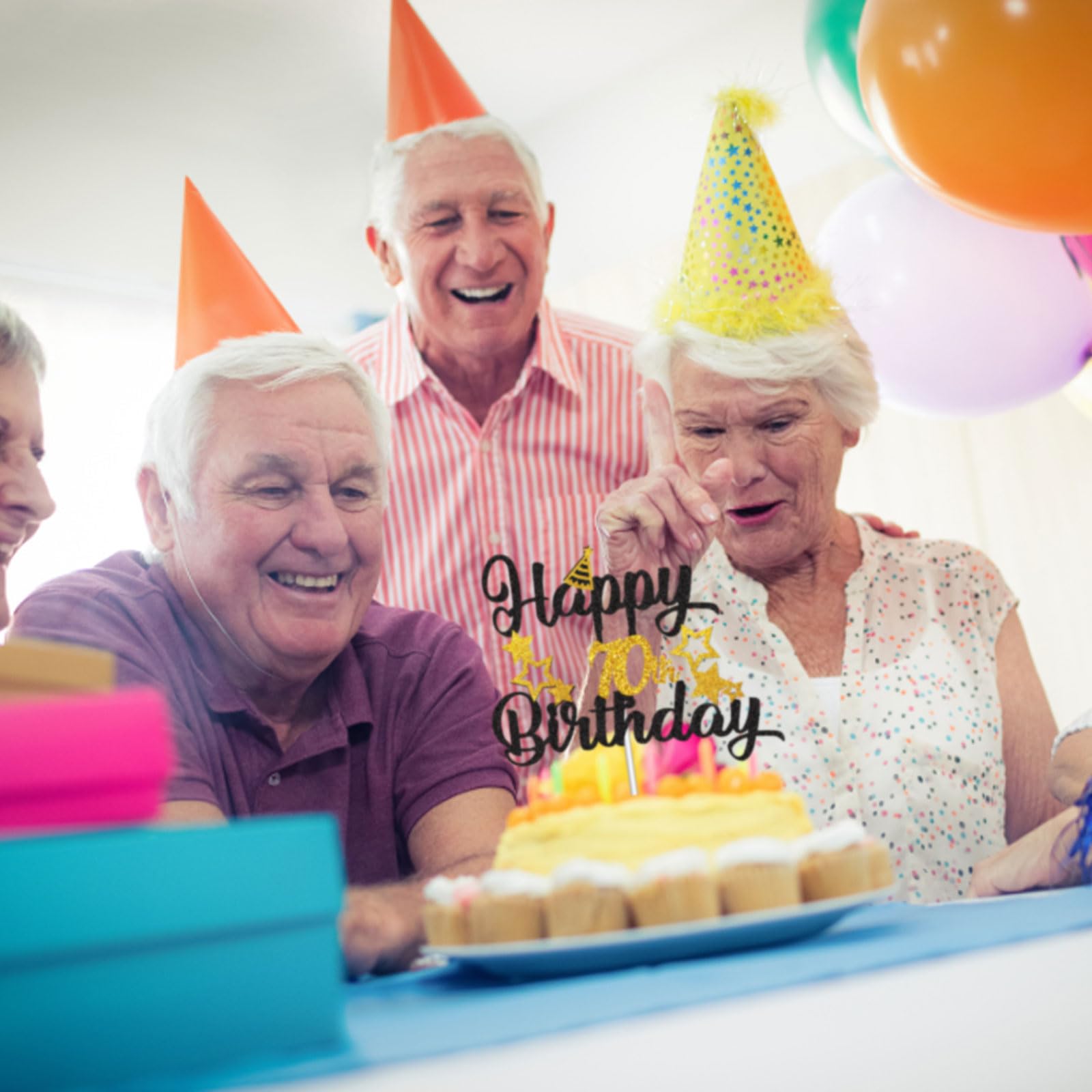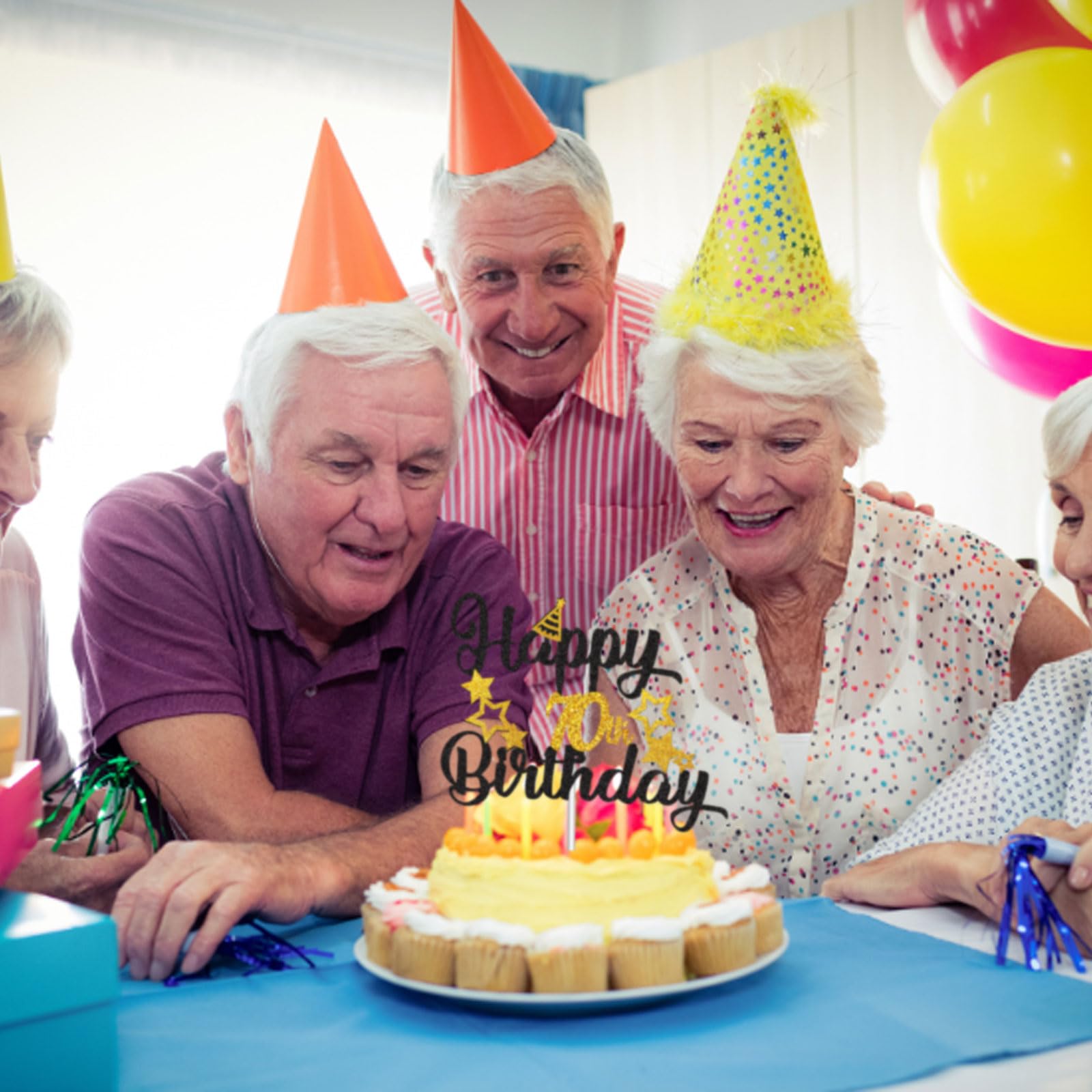 Q: What material is the 70th birthday cake topper made from?A: The 70th birthday cake topper is made from glitter powder paper, which is environmentally friendly and adds a shiny finish to your cake decorations.