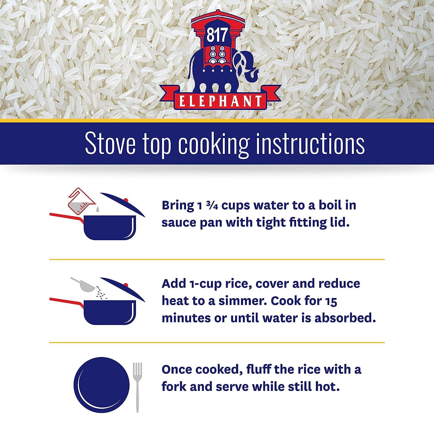 - Q: How should I cook 817 Elephant Jasmine Rice? A: To cook 817 Elephant Jasmine Rice, rinse one cup of rice under cold water until the water runs clear. Then, combine the rinsed rice with one and a half cups of water in a pot. Bring to a boil, then reduce the heat to low, cover, and simmer for about fifteen minutes or until all the water is absorbed. Remove from heat and let it sit, covered, for five minutes before fluffing with a fork.