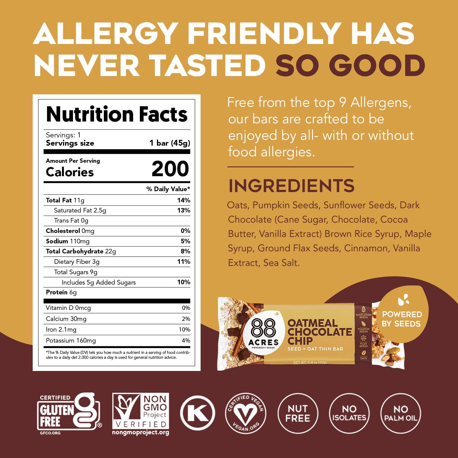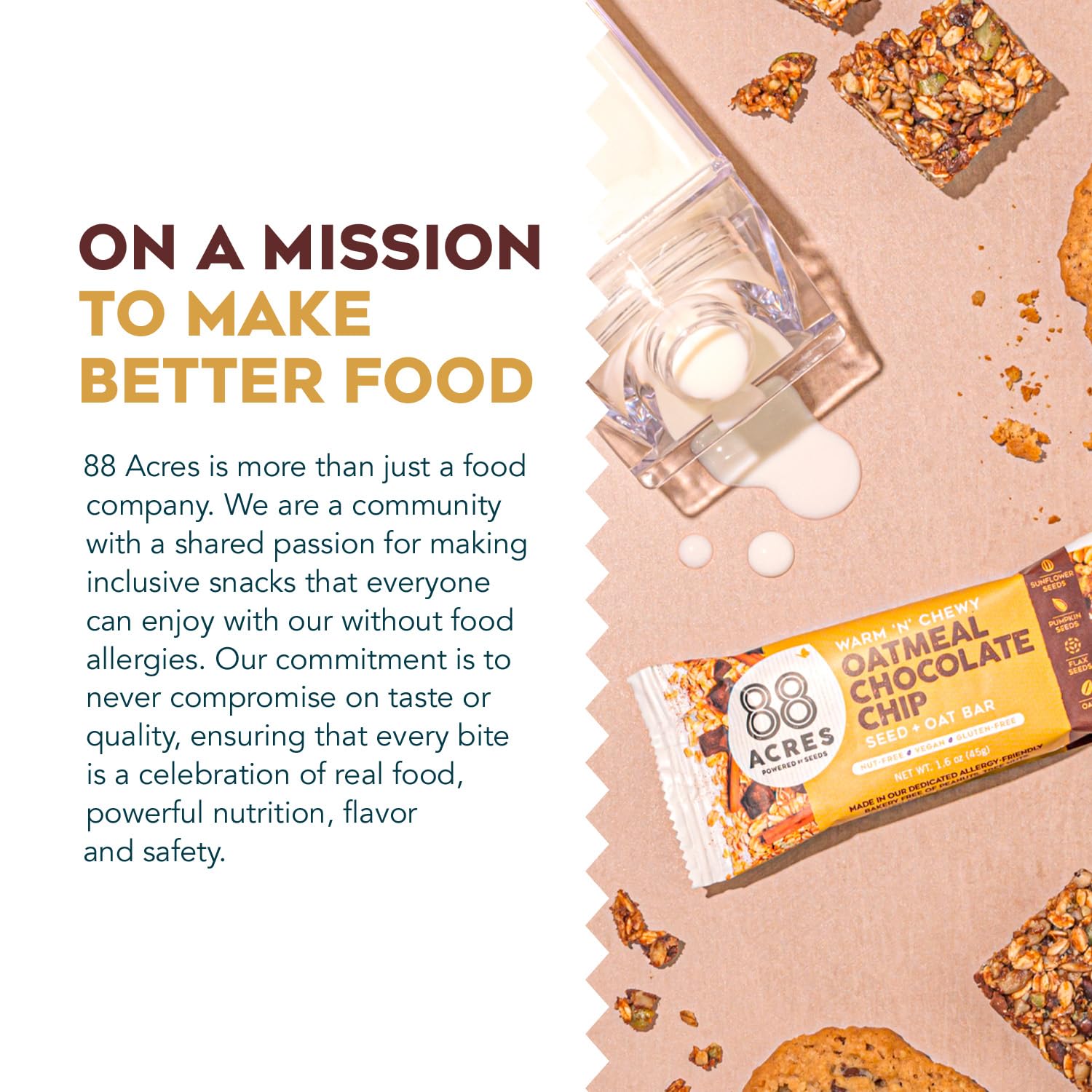 At 88 Acres, we're Making More From Less. We use wholesome ingredients to make a new kind of comfort food with the homemade flavors you love and the superior nutrition you’ve been looking for. Delicious food doesn’t have to be at odds with nutrition or safety - we’re growing that change seed by seed. Seeds are just good nutrition. Every bite of an 88 Acres snack packs that natural seed power: healthy fat, complete protein, and a spectrum of body-boosting minerals and antioxidants, all for more energy from a smaller, simpler source. Made in our dedicated Bakery free of peanuts, tree nuts, dairy, eggs, soy & sesame.