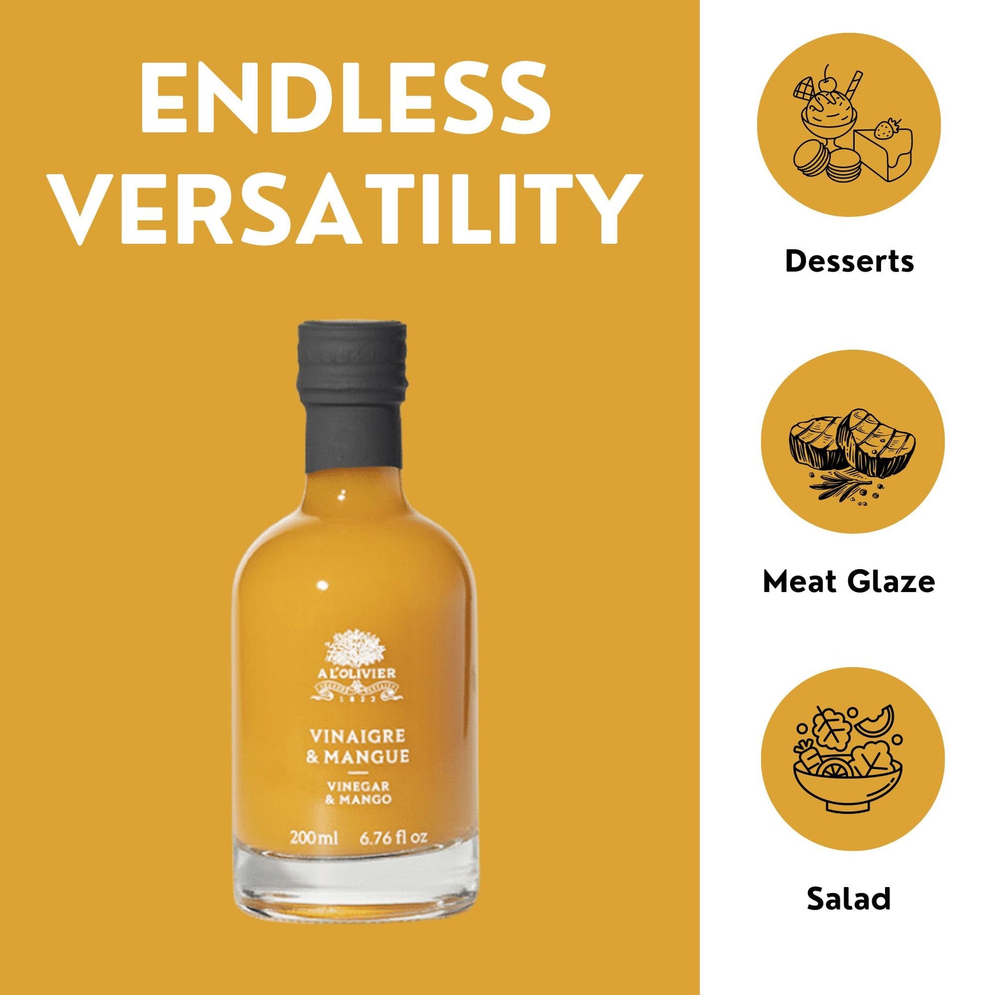 Q: What is A L'Olivier Mango Fruit Vinegar used for?A: A L'Olivier Mango Fruit Vinegar is excellent for enhancing the flavor of salads, finishing pasta dishes, and adding a unique touch to soups. Its fruity and tangy profile makes it a versatile ingredient in various culinary applications.