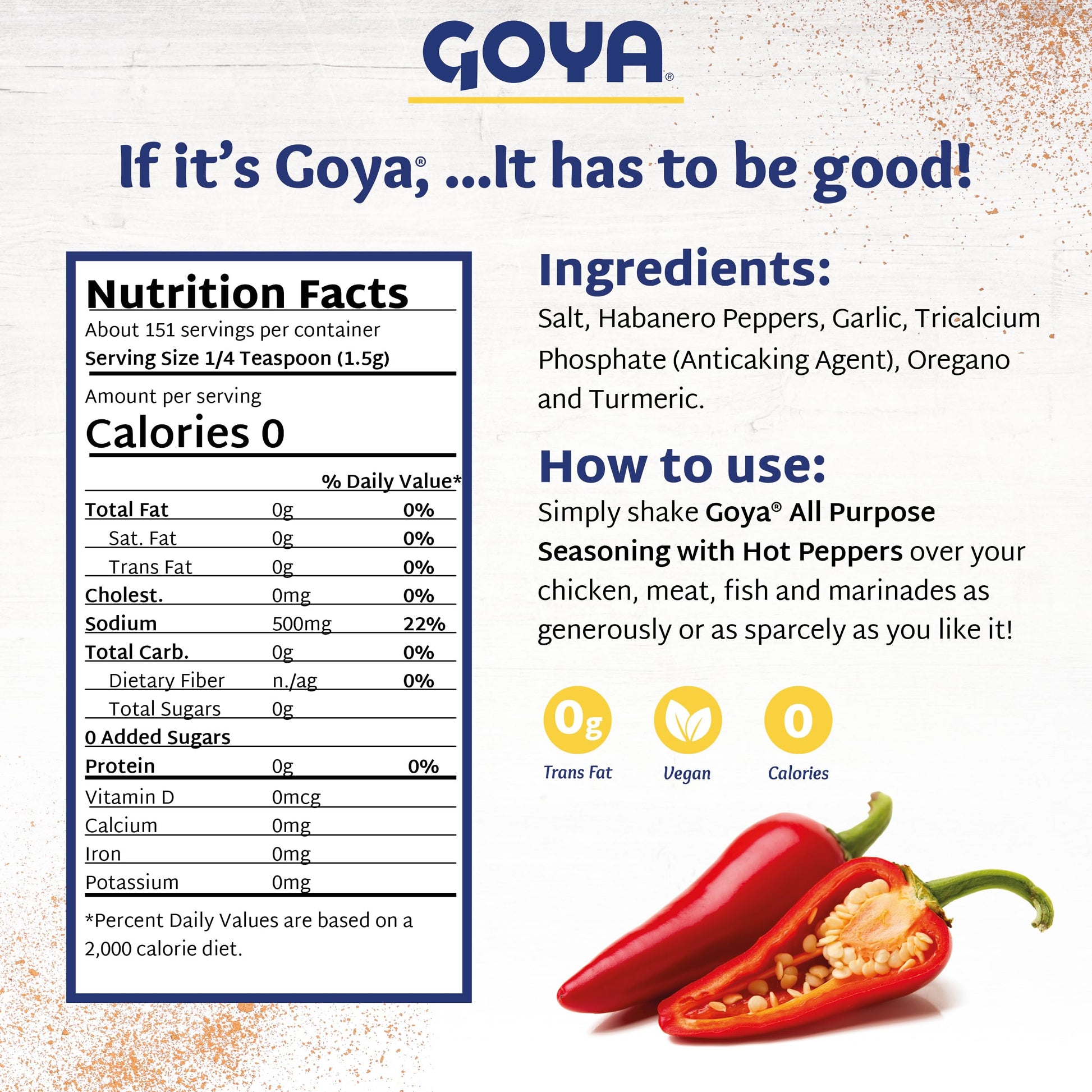 Introducing Goya Adobo All Purpose Seasoning with Hot Pepper – your secret ingredient for bold and spicy flavors! This versatile blend of garlic, oregano, cumin, and Latin spices adds quick and fiery flavor to poultry, seafood, meat, and vegetables. Vegan-friendly and free of trans fat, calories, and cholesterol, it's a must-have for any kitchen. Elevate your dishes with Goya Adobo – because if it's Goya, it has to be good!