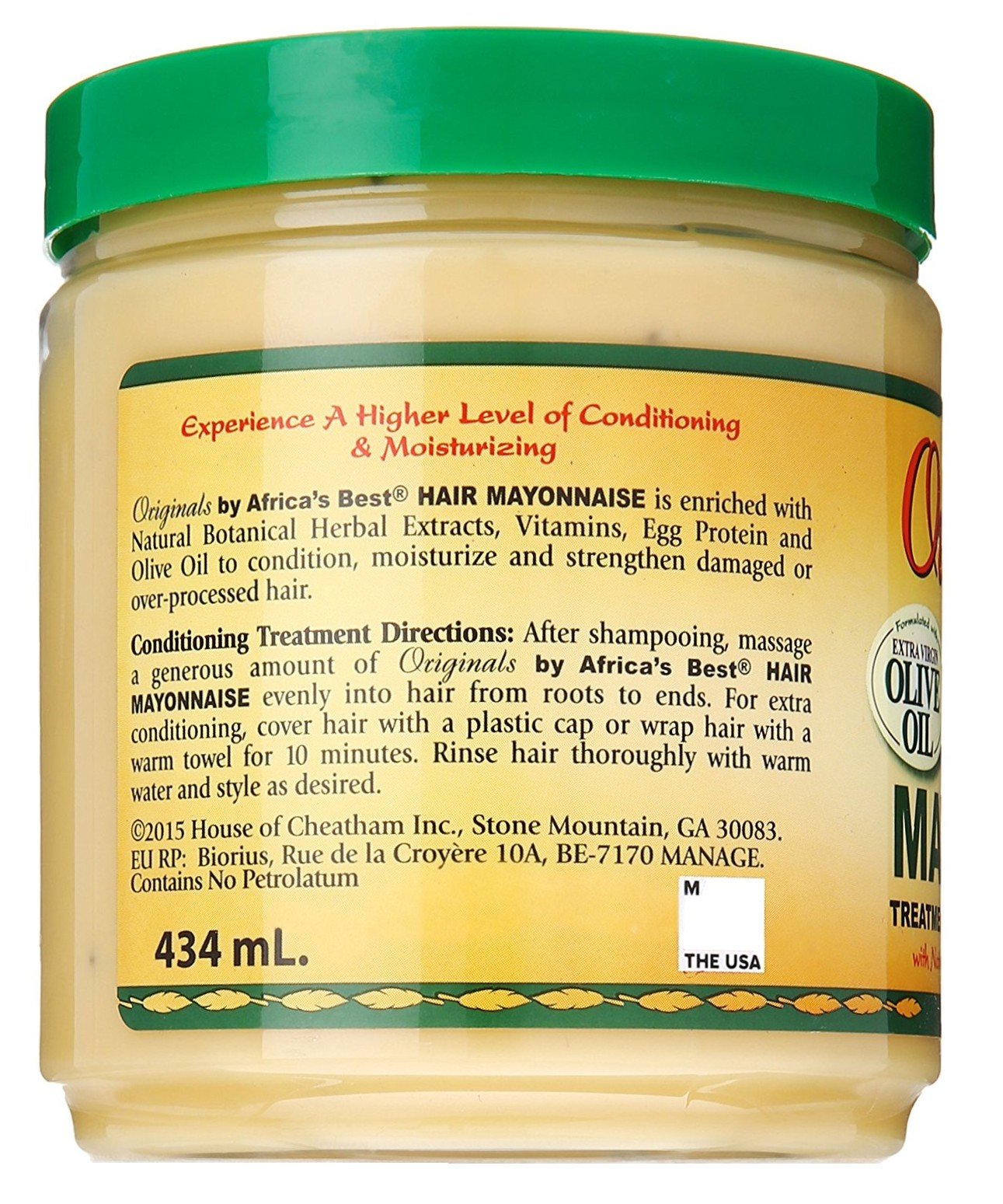 15 ounce with organic herbs, olive oil, and egg protein. Improved organics hair mayonnaise is enriched with natural botanical herbal extracts, vitamins, egg protein and olive oil to condition, moisturize and strengthen damaged or over-processed hair. With consistent use, it help rejuvenate and renew weak fragile hair leaving the hair healthier looking with greater body shine, elasticity and moisture. Contains no petroleum. Made in USA.