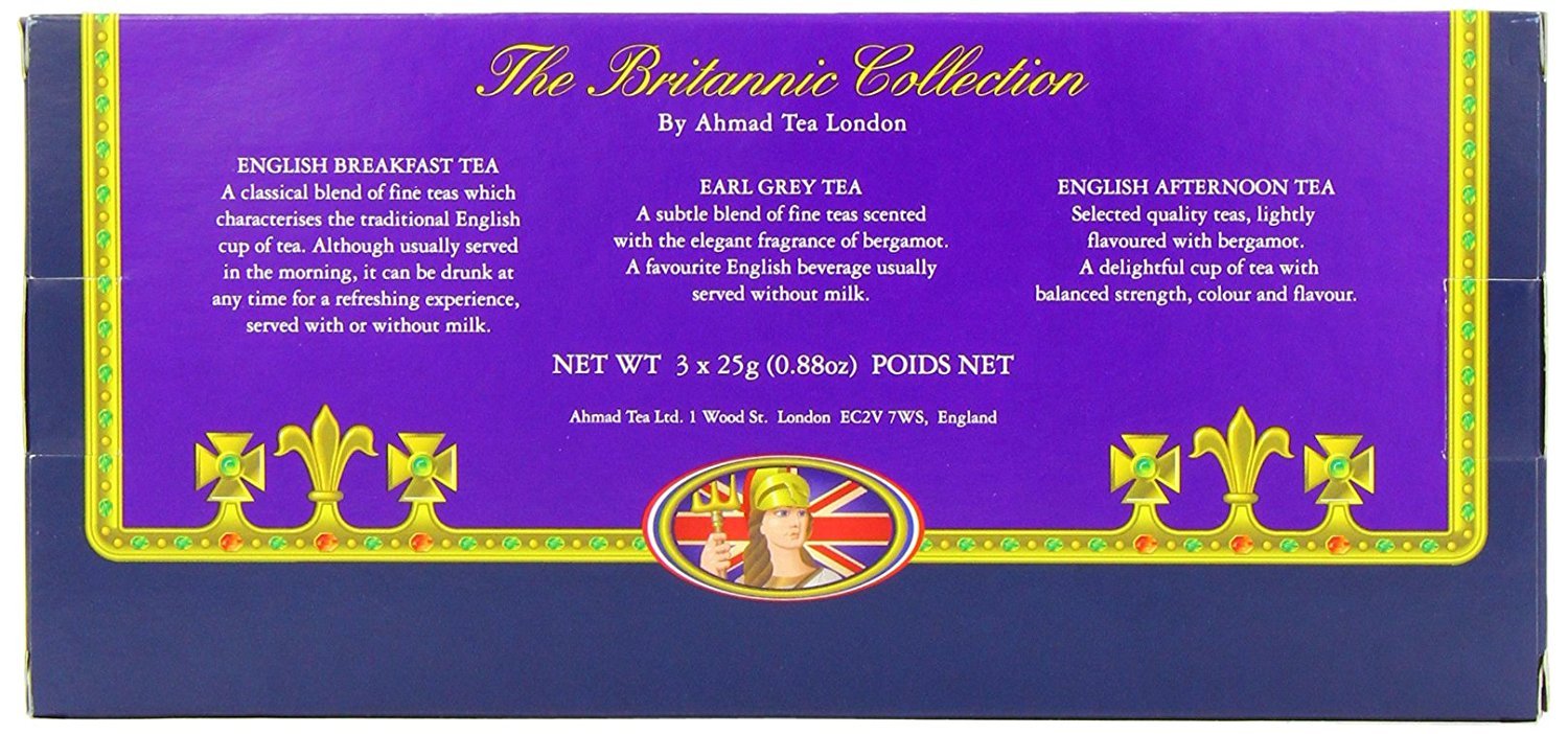 Q: What types of tea are included in the Ahmad Tea Britannia Collection?A: The Ahmad Tea Britannia Collection includes three popular varieties: English Breakfast, Earl Grey, and English Afternoon. Each variety is carefully crafted to provide a delicious and satisfying flavor.