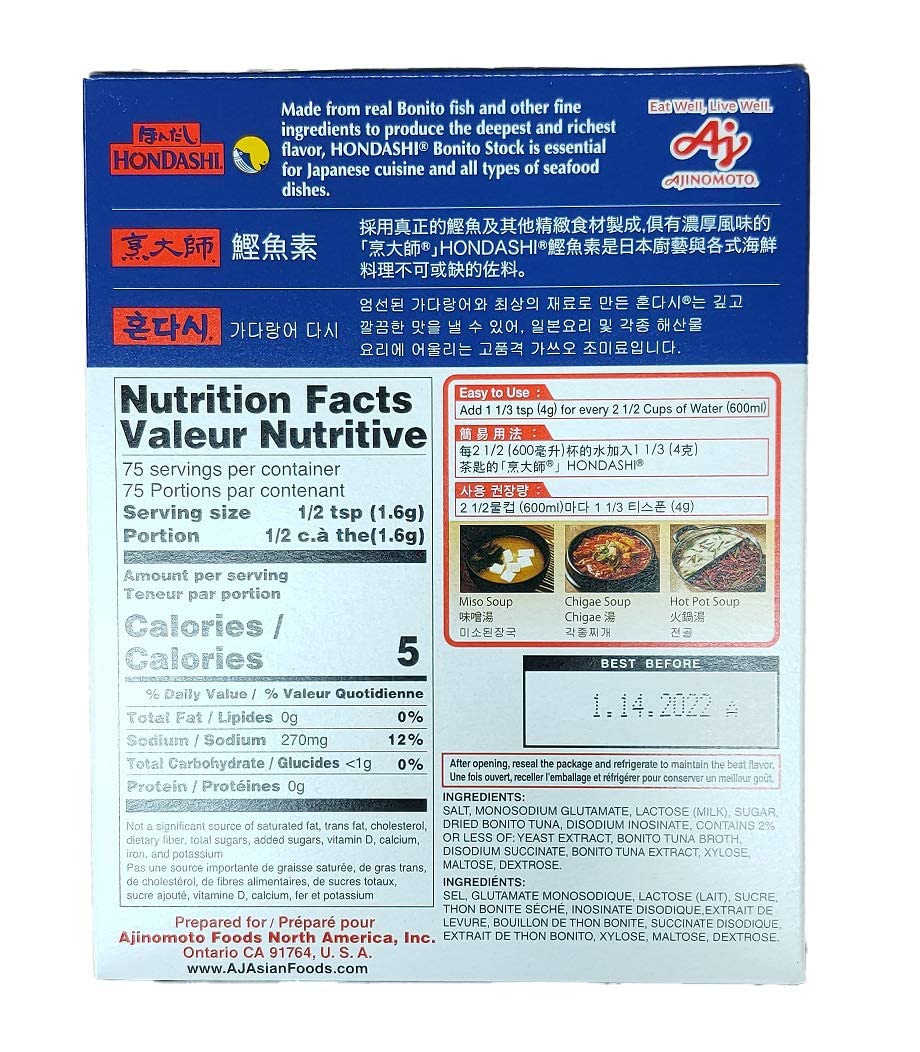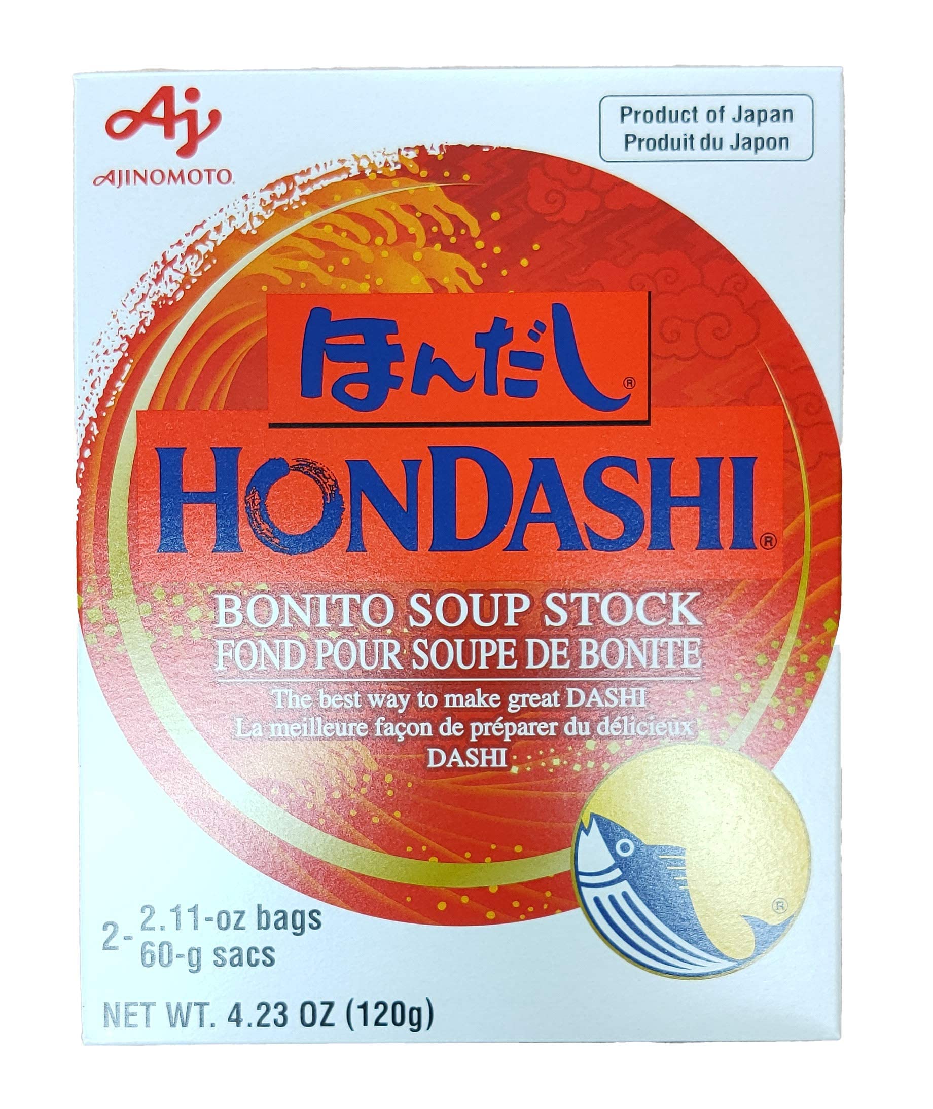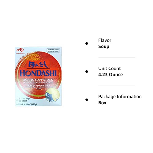 Q: How many servings does one box of Ajinomoto Hon Dashi provide?A: Each box of Ajinomoto Hon Dashi contains two bags of powdered dashi, with each bag weighing 2.11 oz, allowing for multiple servings depending on your recipe requirements.