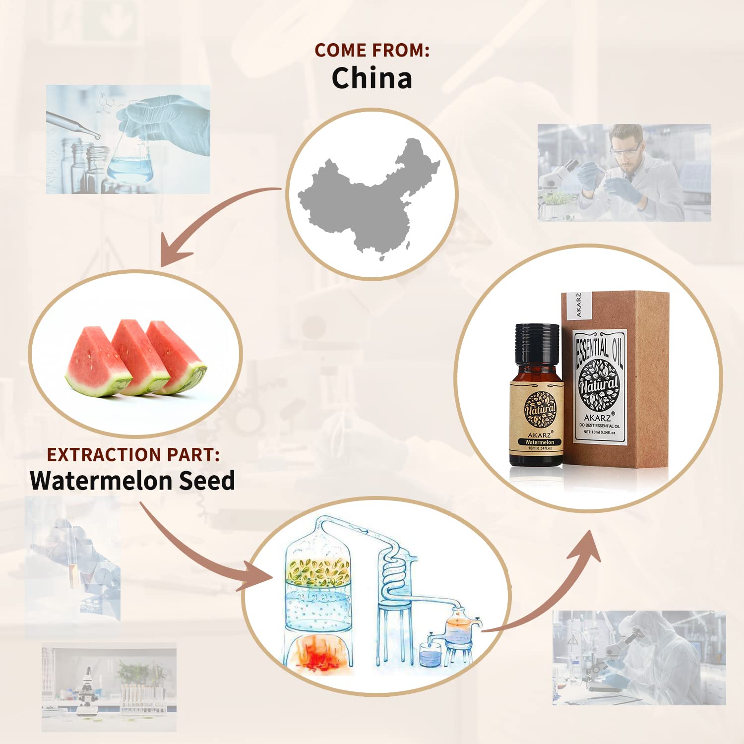 - Q: What are the benefits of using AKARZ Watermelon Essential Oil for skin care? A: AKARZ Watermelon Essential Oil is known for its hydrating and nourishing properties, making it ideal for skin care. It can help improve skin texture, reduce dryness, and provide a refreshing scent, enhancing your overall skincare routine.