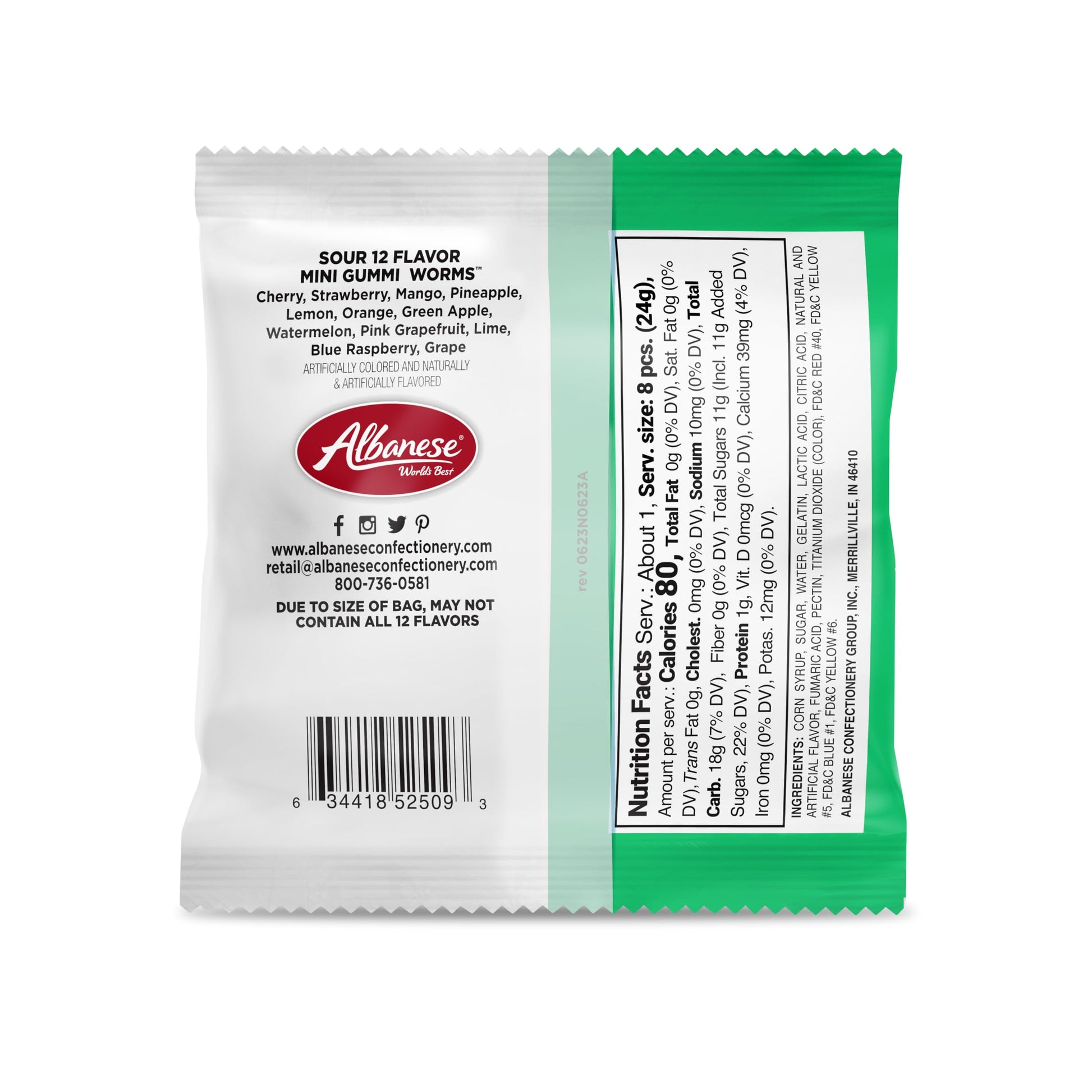 - Q: What is the weight and packaging of the Albanese Gummy Worms? A: The Albanese World's Best Sour Mini Gummi Worms come in a 0.85-ounce bag, and this product is available in a pack of 200 bags, perfect for sharing or stocking up.