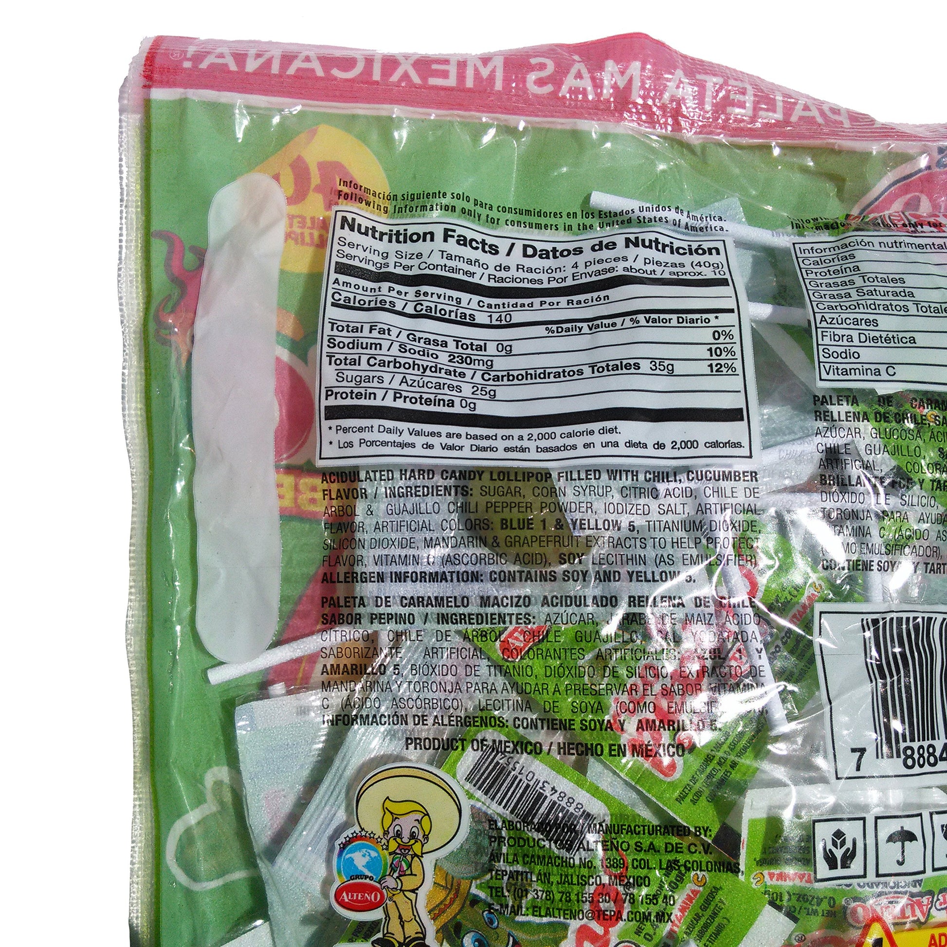 This sale is for a bag of ALTENO RICO PEPINO (CUCUMBER) lollipop with chiliQty on bag 40 lollipopNet wt 14.10oz