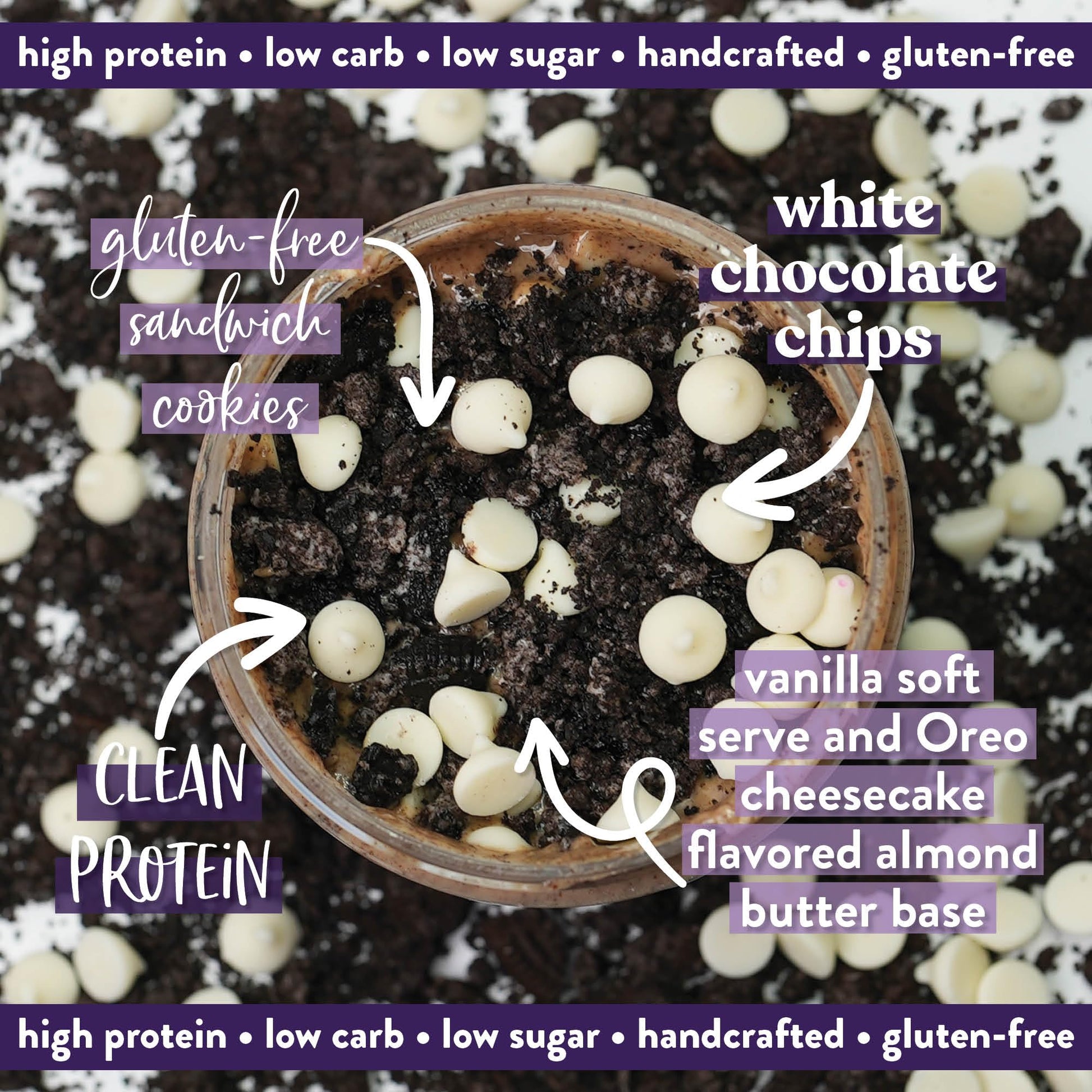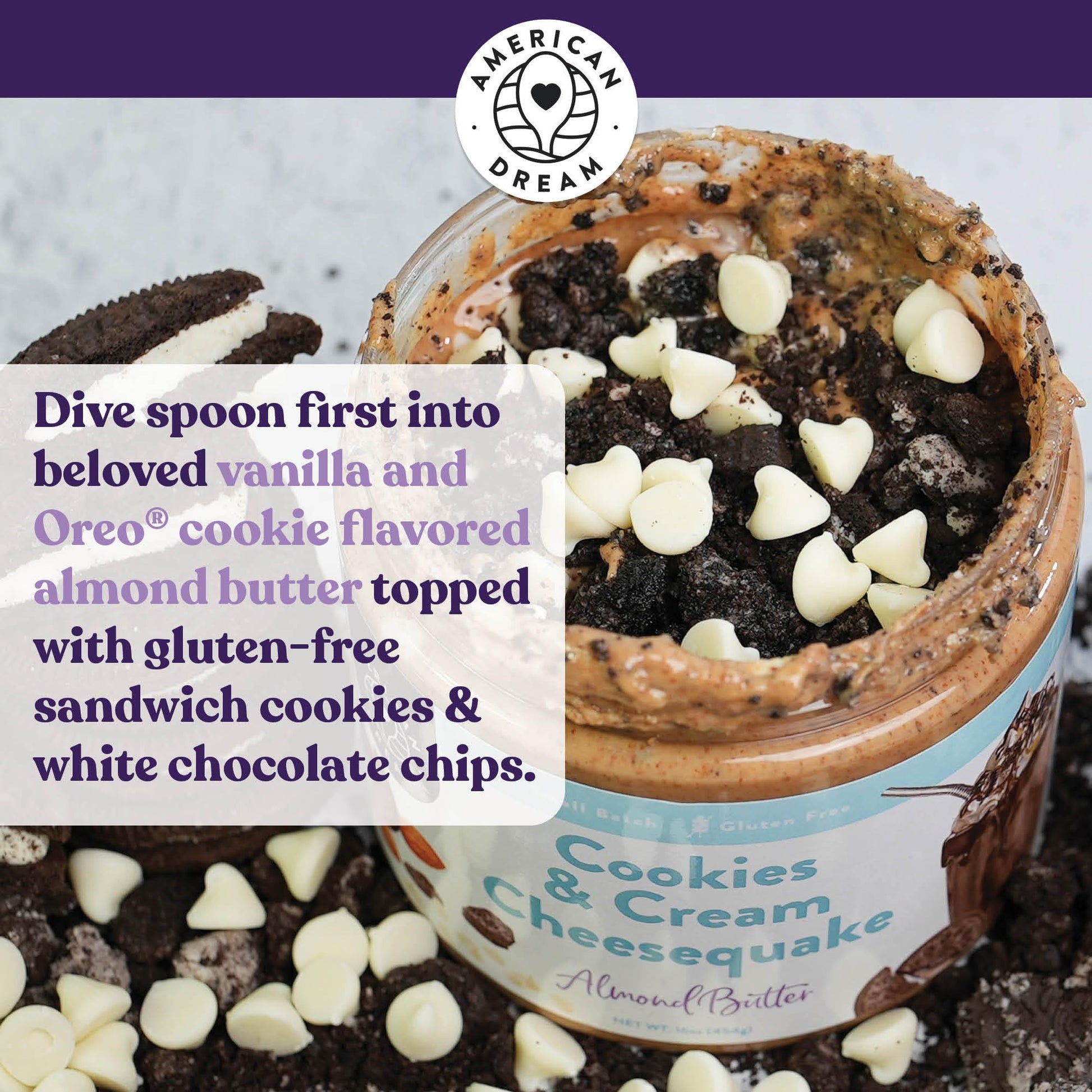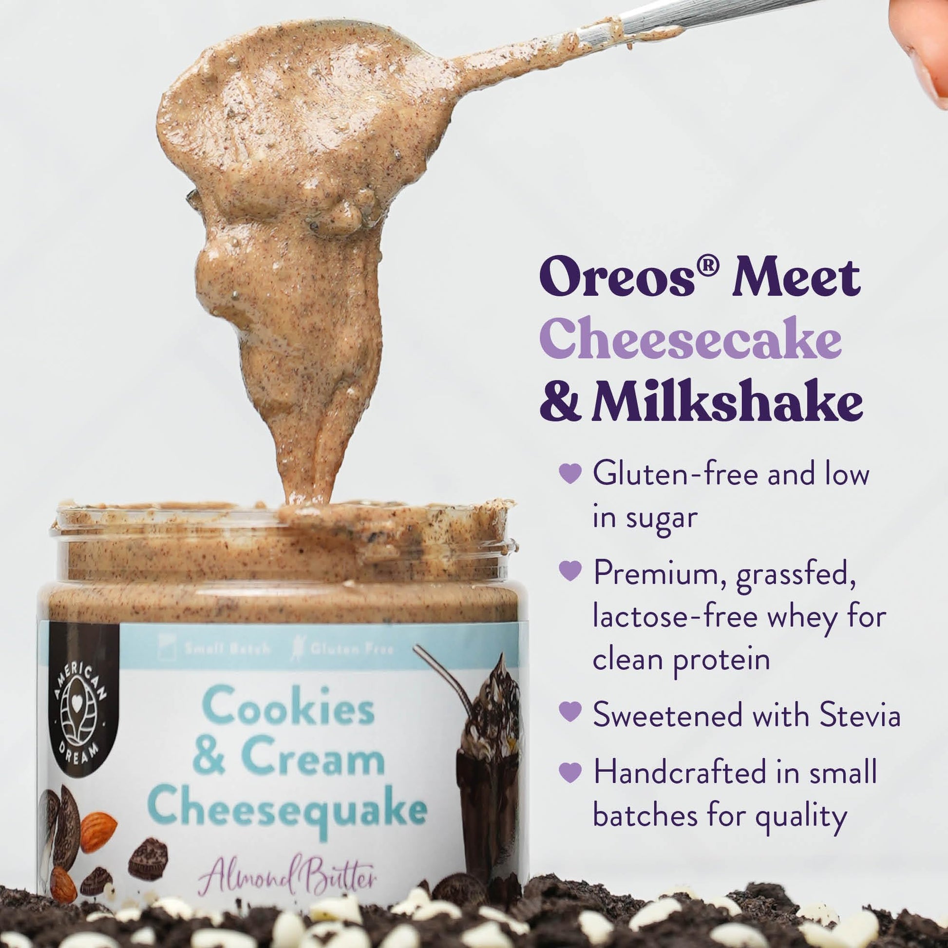 Cookies & Cream Meets Cheesecake Meets Milkshake To Recreate All The Flavors Of A Beloved Cool, Creamy Ice Cream Treat! Each Spoonful Of This Indulgent Small Batch Almond Butter Is Exploding With Nostalgic Vanilla Soft Serve And Oreo Cheesecake Flavor. Adding The Perfect Crunch, Each Jar Of Gourmet Almond Butter Is Topped With Crushed Gluten-Free Chocolate Sandwich Cookies And Premium White Chocolate Chips. Our Small Batch, Handcrafted Cookies & Cream Cheesequake Almond Butter Is 100% Gluten-Free And Gets An Extra Dose Of Clean Protein From Our Premium, Grassfed, Lactose-Free Whey. Naturally Low In Sugar, Our Butter Base Is Sweetened Lightly With Stevia. The Only Added Sugars Youll Find Will Come From Our Hand-Measured And Hand-Topped Mix-Ins! Please Refer To Our Nutritional Label For Detailed Allergen And Ingredient Information.