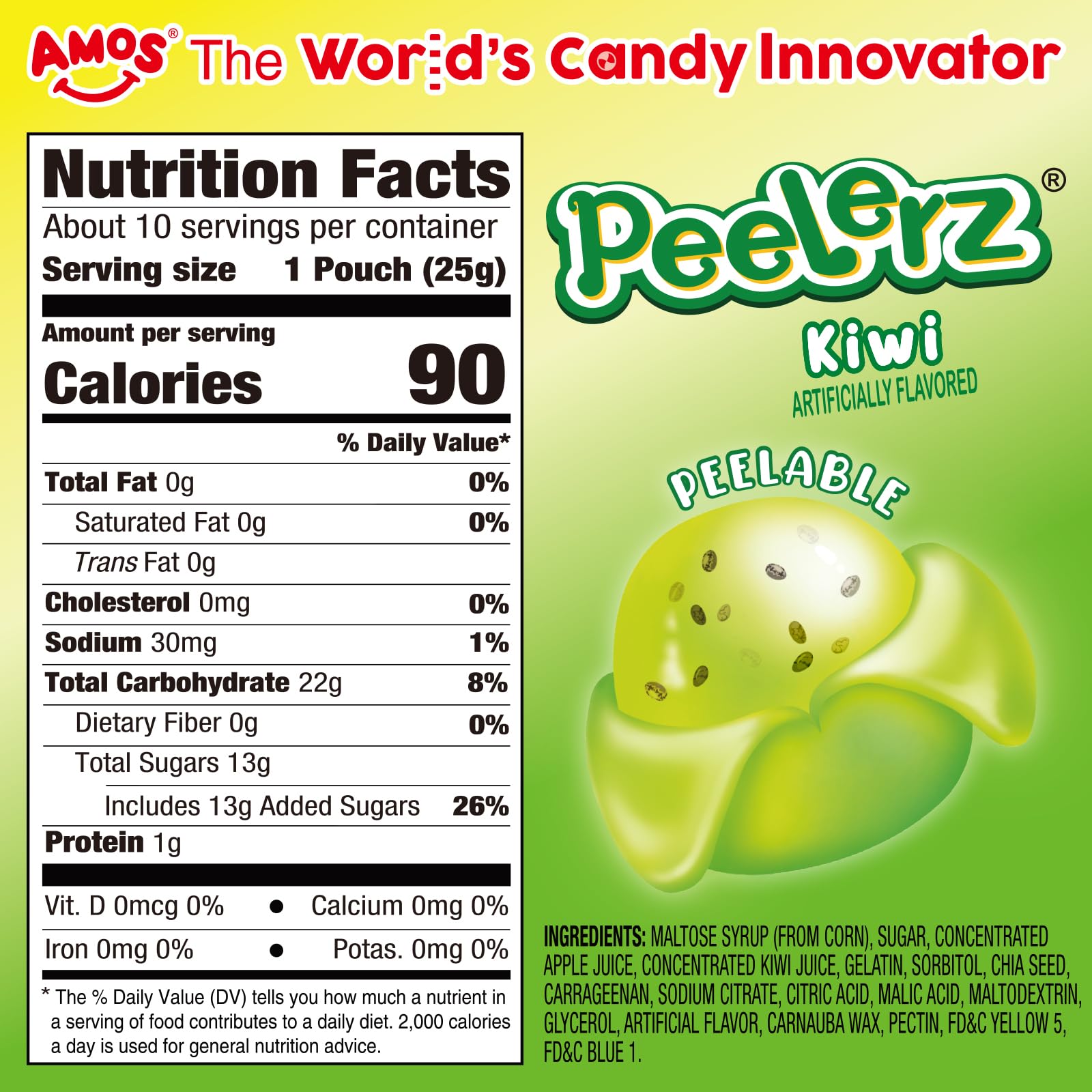 Q: What are AMOS Peelerz Kiwi Gummy Candy made of?A: AMOS Peelerz Kiwi Gummy Candy is made with real fruit juice, providing a vibrant kiwi flavor. The candy also includes chia seeds, adding a unique texture and nutritional benefit.