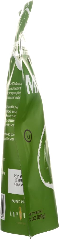 Q: What is the packaging of Amphora Dried Mangoes like?A: Amphora Dried Mangoes are carefully packaged in 3 oz. aluminum resealable bags, which help maintain freshness and make it easy to enjoy the mangoes on the go.