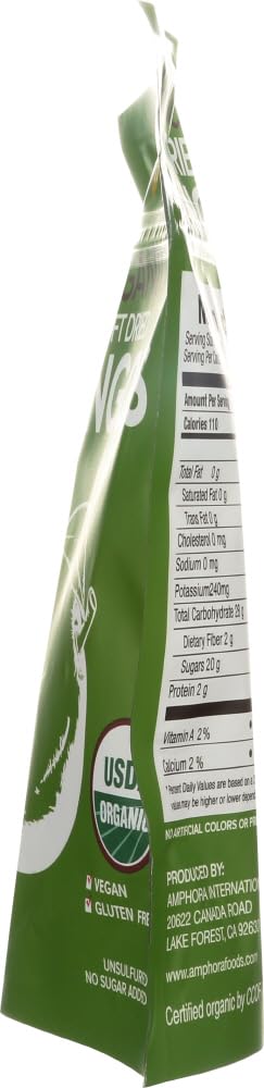 Q: What makes Amphora Dried Mangoes a healthy snack option?A: Amphora Dried Mangoes are a healthy snack because they are organic, vegan, and gluten-free, containing no added sugars or preservatives. They are made from tree-ripened mangoes that provide natural sweetness and essential nutrients.
