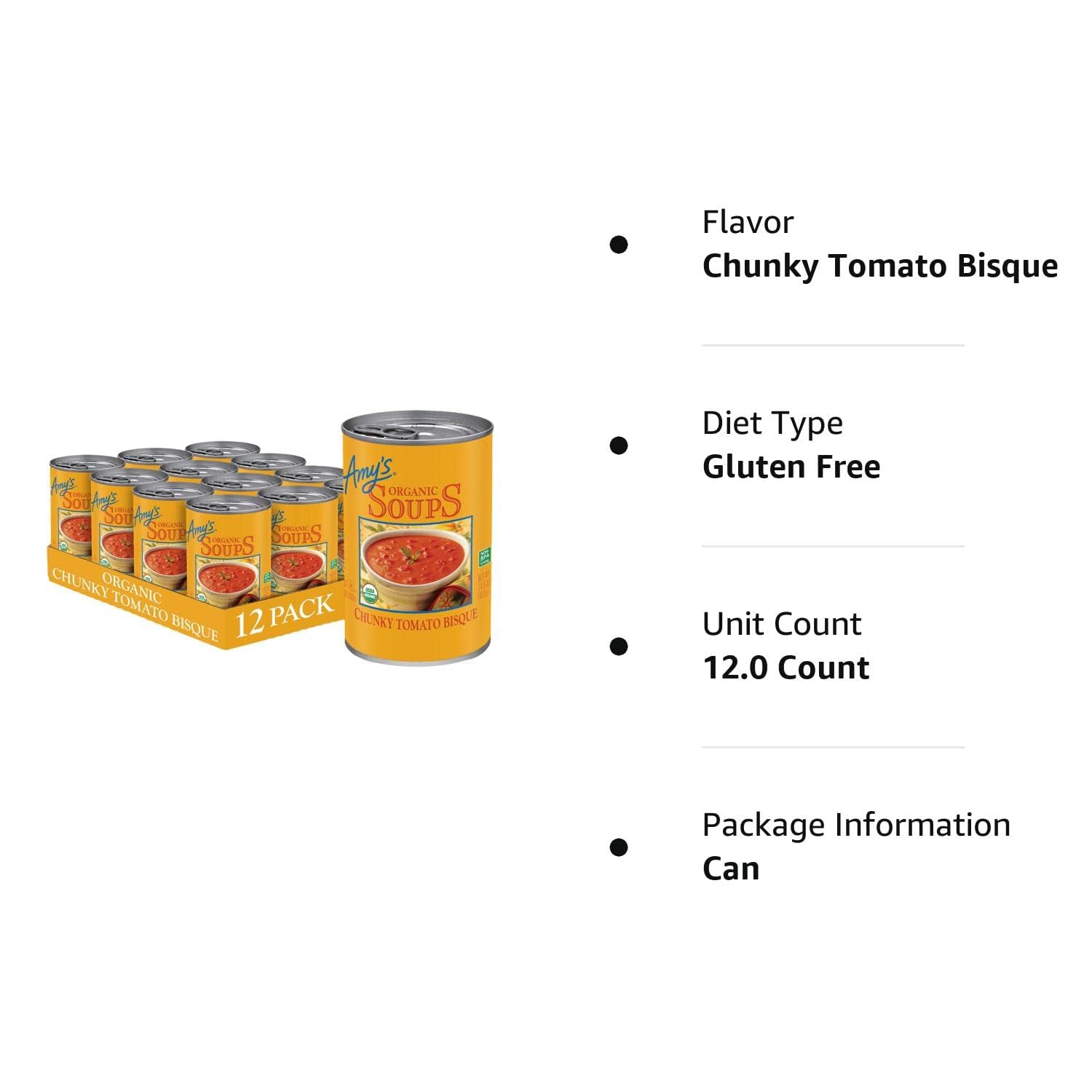 Q: What are the key ingredients in Amy's Chunky Tomato Bisque?A: Amy's Chunky Tomato Bisque is made with organic sun-ripened tomatoes and a touch of organic cream, ensuring a smooth and creamy texture without compromising on flavor.