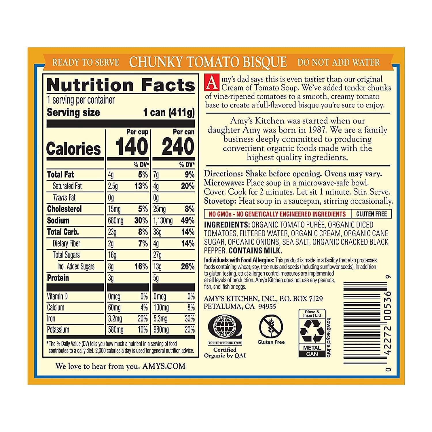Q: What is the serving size and nutritional content of this soup?A: Each serving of Amy's Chunky Tomato Bisque is 14.5 ounces and contains 5g of plant-based protein and 4g of fiber, making it a nutritious choice for a quick meal.