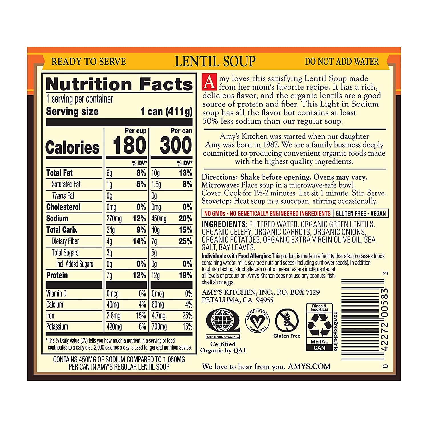 Q: What makes Amy's Vegan Lentil Soup a healthy choice?A: Amy's Vegan Lentil Soup is not only low in sodium with 50% less than other canned soups, but it is also made from USDA-certified organic ingredients, ensuring a high-quality, nutritious meal option without harmful chemicals.