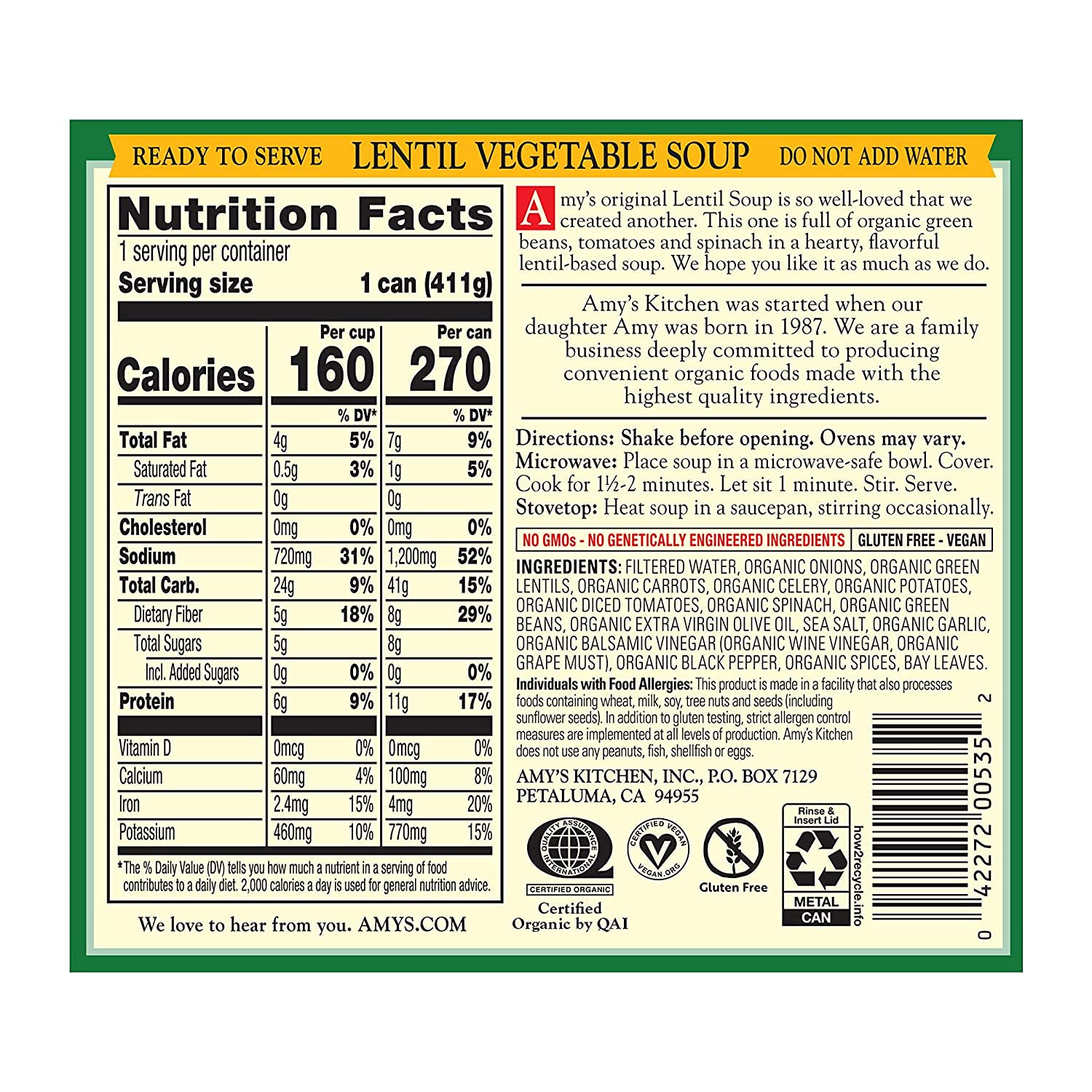 Amy's Organic Lentil Vegetable Soup has a robust, satisfying flavor the whole family will love. Our Lentil Vegetable Soup is made from scratch with organic lentils, sweet organic carrots, vine-ripened tomatoes and tender green beans. The organic lentils provide a good source of dietary fiber (5g) and protein (6g) per serving, as well. Like all of our soups, we start from scratch, stirring in spices and vegetables, then simmering slowly for hours until the flavor is perfect for a home-cooked taste. Amy's Organic Lentil Vegetable Soup is made from non-GMO ingredients and is gluten free, dairy and lactose free, soy free, corn free and tree nut free. It is also suitable for vegan diets. All the fruits, vegetables and grains we use are grown without the use of insecticides, GMOs and other harmful chemicals. We prepare these ingredients with the same careful attention in our kitchen as you would in your own home for high-quality, home-style vegetarian and vegan meals. No meat, fish, shellfish, poultry, eggs or peanuts are ever used in any Amy's products. Even though you're heating up our meals in your home, we want each bite to taste like you're a guest in ours.