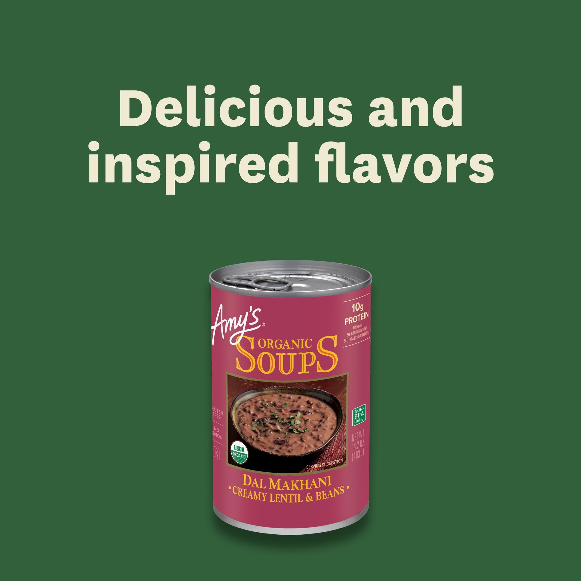 Q: What ingredients are in Amy's Dal Makhani Creamy Lentil & Beans Soup?A: Amy's Dal Makhani Creamy Lentil & Beans Soup is made with organic lentils, beans, and a blend of spices, all crafted to create a rich and creamy texture. It is USDA certified organic, gluten-free, and non-GMO.