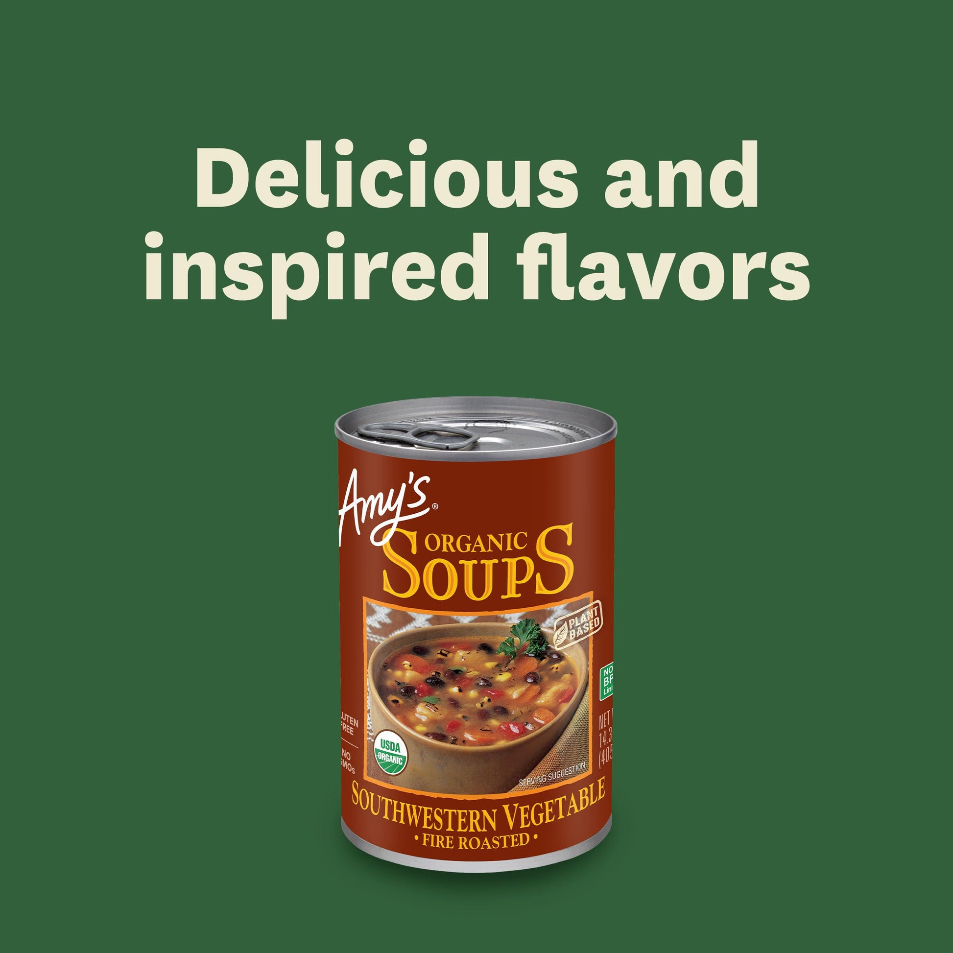 Q: How much protein and fiber does Amy's Soup provide?A: Each serving of Amy's Fire Roasted Southwestern Vegetable Soup provides 4g of plant-based protein and 5g of fiber, making it a satisfying and nutritious meal option.