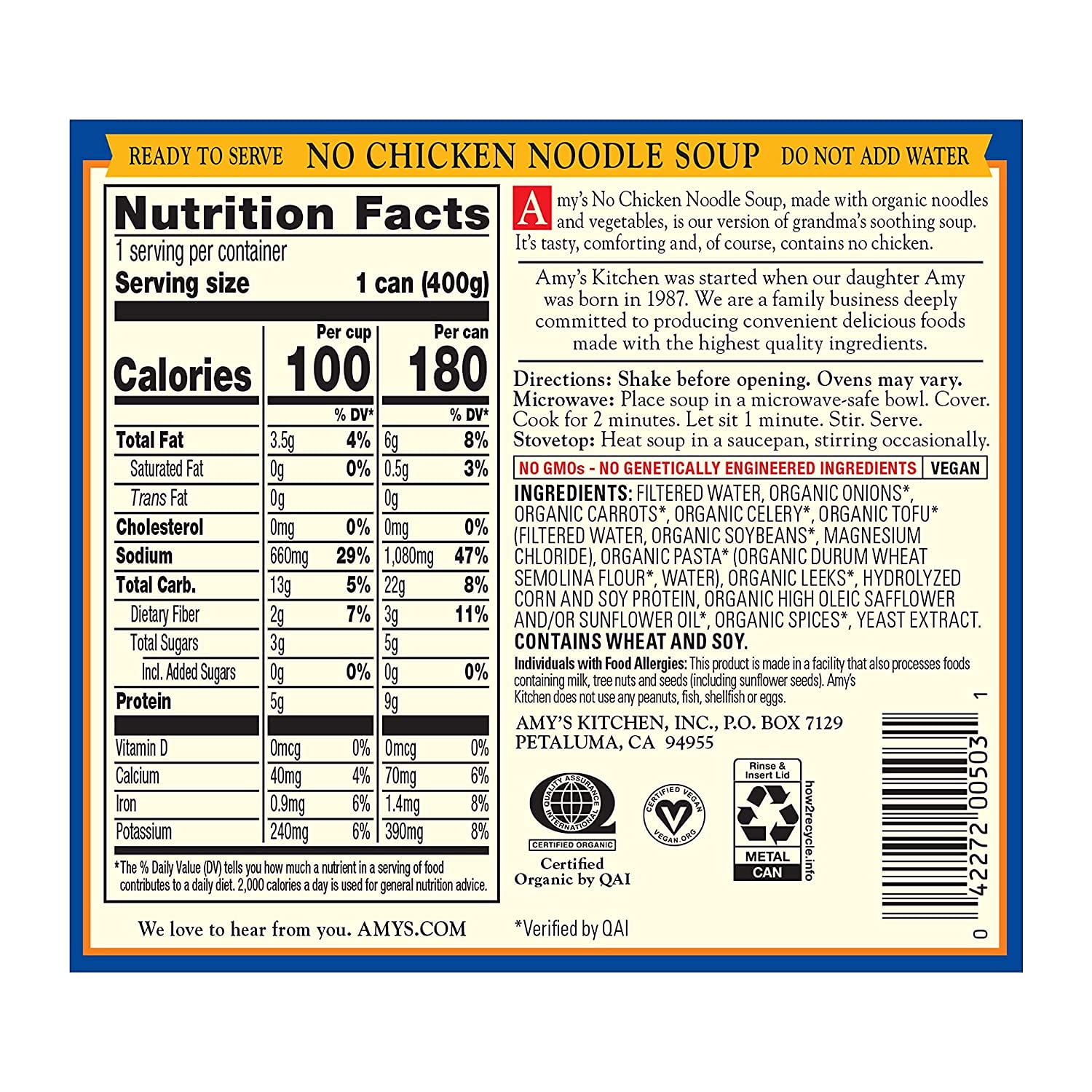 Amy's No Chicken Noodle Soup is our meatless version of the classic comfort soup. Our low fat (6g) No Chicken Noodle Soup is made from scratch with organic tofu, carrots, celery, leeks, onions, noodles and spices. Like all of our soups, we start from scratch stirring in spices and vegetables, then simmering slowly for hours until the flavor is perfect for a home-cooked taste. Amy's No Chicken Noodle Soup is made from non-GMO ingredients and is dairy free, lactose free, tree nut free, and suitable for vegan and kosher diets. Since 1987, we at Amy’s Kitchen have produced delicious, convenient foods for people who are sometimes too busy to cook. Amy’s is a family-run business, and we supervise every aspect of our business and take pride in customer satisfaction. All the fruits, vegetables and grains we use are grown without the use of insecticides, GMOs and other harmful chemicals. We prepare these ingredients with the same careful attention in our kitchen as you would in your own home for high-quality, home-style vegetarian and vegan meals. No meat, fish, shellfish, poultry, eggs or peanuts are ever used in any Amy's products. Even though you're heating up our meals in your home, we want each bite to taste like you're a guest in ours.