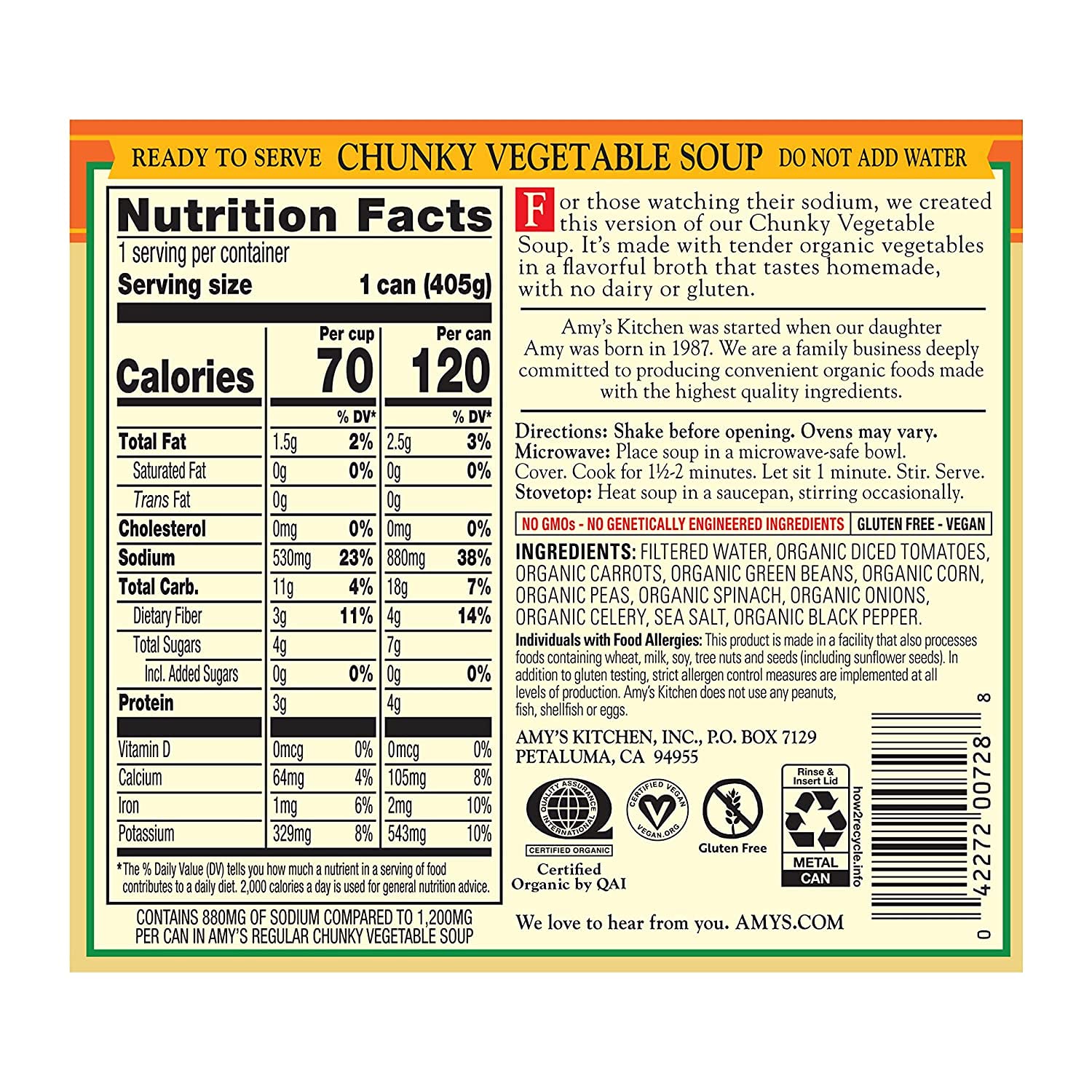 This is our kind of party-a garden party. Amys Organic Chunky Vegetable Soup showcases the bright flavors of the garden with tender organic carrots, green beans, sweet corn, peas and spinach, simmered to perfection in a savory, tomato based broth. Because our chefs only use USDA organic vegetables and seasonings, this chunky vegetable soup is non-GMO, gluten free, dairy free and suitable for all vegetarian, vegan and kosher diets. Plus its naturally low in fat, with only 1.5g of fat per cup. Simply heat and serve for a satisfying bowl of soup in minutes. Since 1987, we at Amys Kitchen have produced delicious, organic, convenient foods for people who are sometimes too busy to cook. All the fruits, vegetables and grains we use are grown without the use of insecticides, GMOs and other harmful chemicals. We prepare these ingredients with the same careful attention in our kitchen as you would in your own home for high-quality, home-style vegetarian and vegan meals. No meat, fish, shellfish, poultry, eggs or peanuts are ever used in any Amy's products. Even though you're heating up our meals in your home, we want each bite to taste like you're a guest in ours.