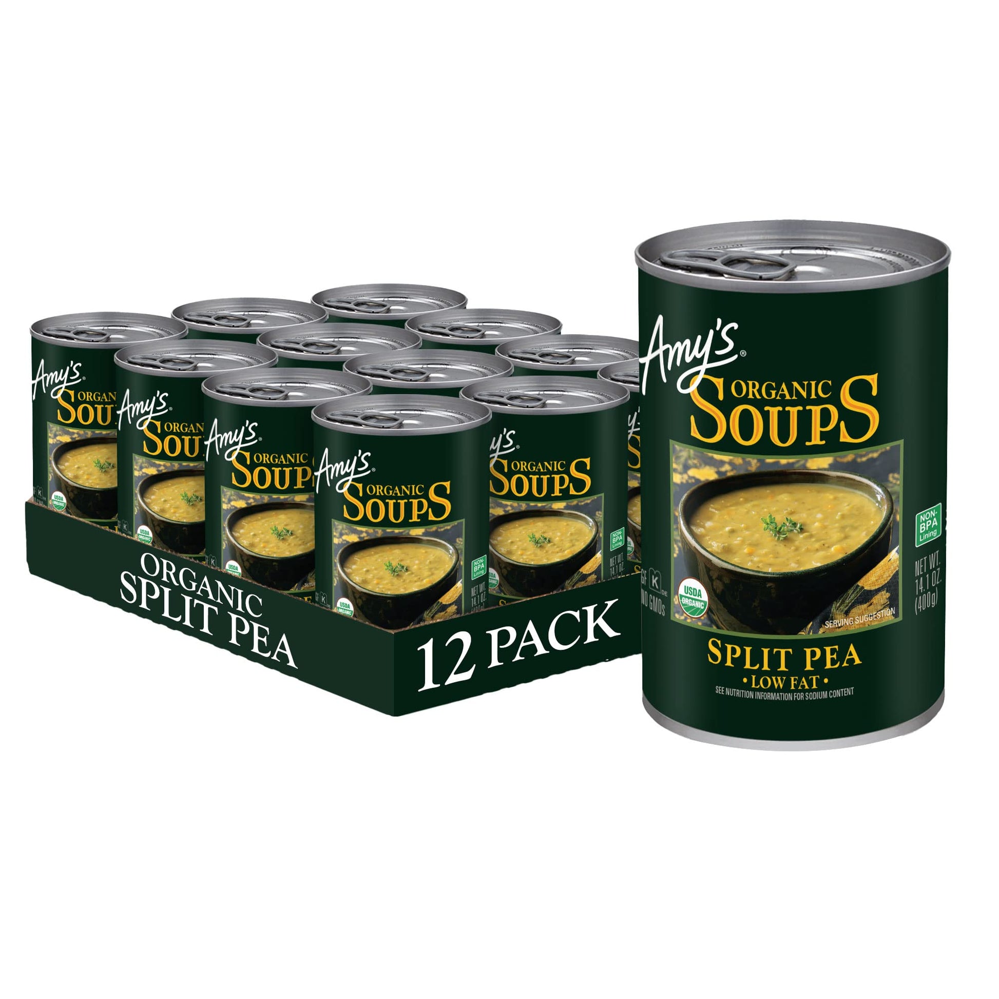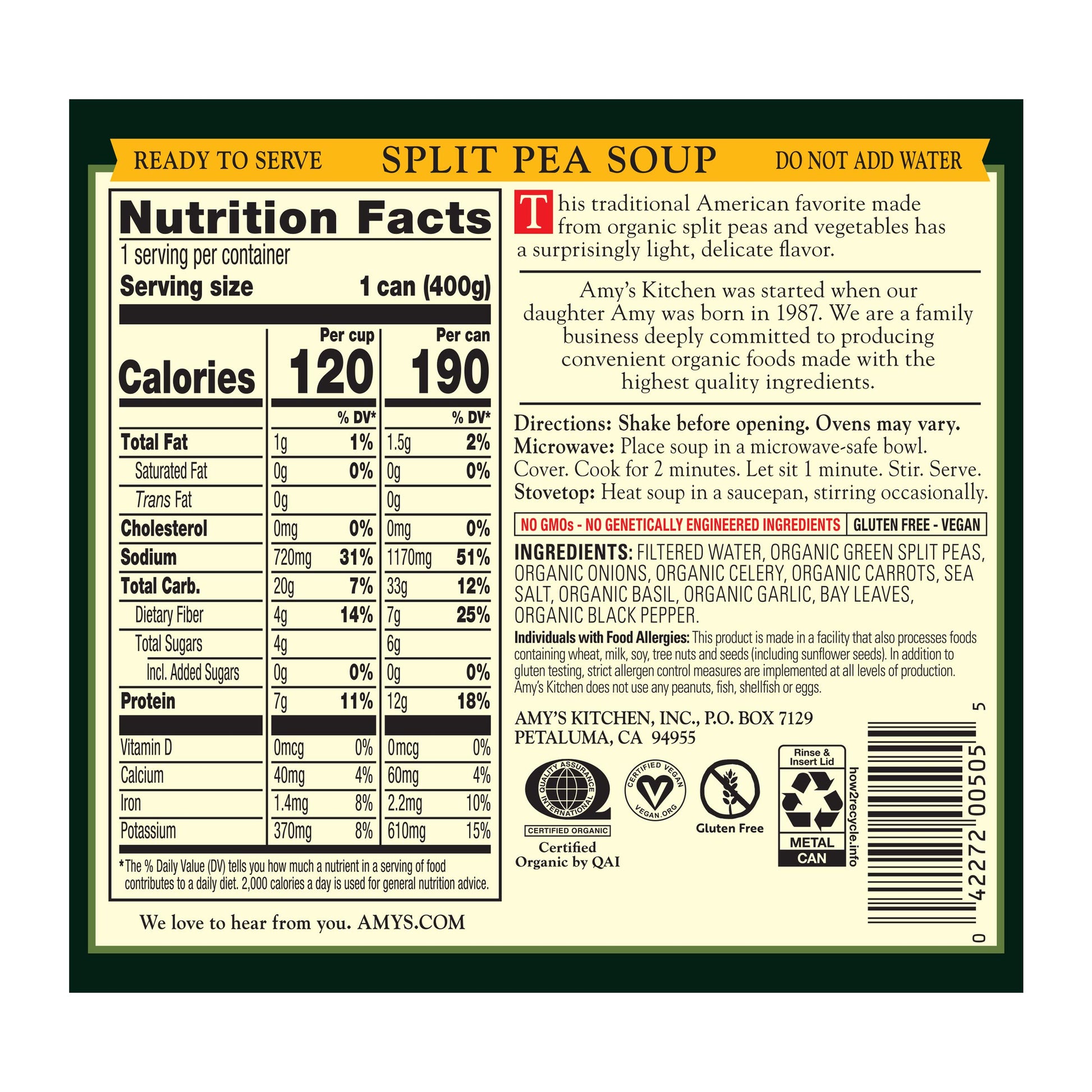 Q: What is the nutritional content of Amy's Vegan Split Pea Soup?A: Each serving of Amy's Vegan Split Pea Soup contains 12g of plant-based protein and 7g of fiber, making it a nutritious choice for a healthy meal.