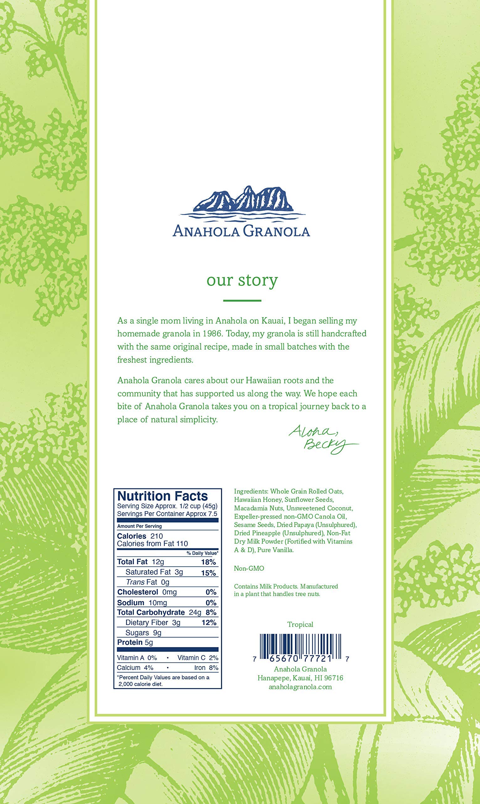??HEALTHY GRANOLA THAT TASTES GREAT - All of our granola cereal is made with purely natural food and is a great & healthy cereal alternative! Our original granola promises to be healthy and still taste great! | ??GREAT SNACK FOR ALL AGES - Our granola is a healthy snack for adults and kids alike and is loved by all ages for its amazing taste! We enjoy being a beloved healthy snacks prime pantry brand for all ages! | ??NO ADDED SUGAR - Enjoy the sweet taste of granola sweetened with Hawaiian honey while having the peace of mind that you are making a healthy food choice with granola that has zero added sugar! | ??HAWAIIAN HANDMADE GRANOLA - Anahola Granola has been handmade with care since 1986! We strive to make sure our granolas are the perfect vegan protein bars for your office snacks, snack basket, or delicious granola breakfast cereal! | ??GLUTEN FREE - Our granola is gluten free and high in fiber making it a great option as a breakfast food, travel snack, granola for yogurt, kids snack, or one of the best snacks for adults we can think of!
