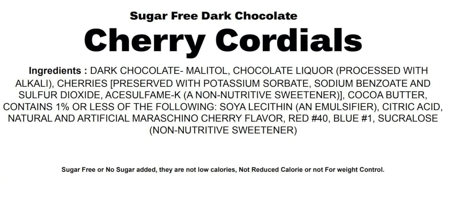 - Q: What are the main ingredients in Andy Anand Gourmet Sugar Free Dark Chocolate Cherry Cordials? A: The main ingredients in our Sugar Free Dark Chocolate Cherry Cordials include whole cherries, sweet liquid fondant, and premium dark chocolate. We use natural sweeteners like stevia and maltitol to ensure a delightful taste without the sugar.