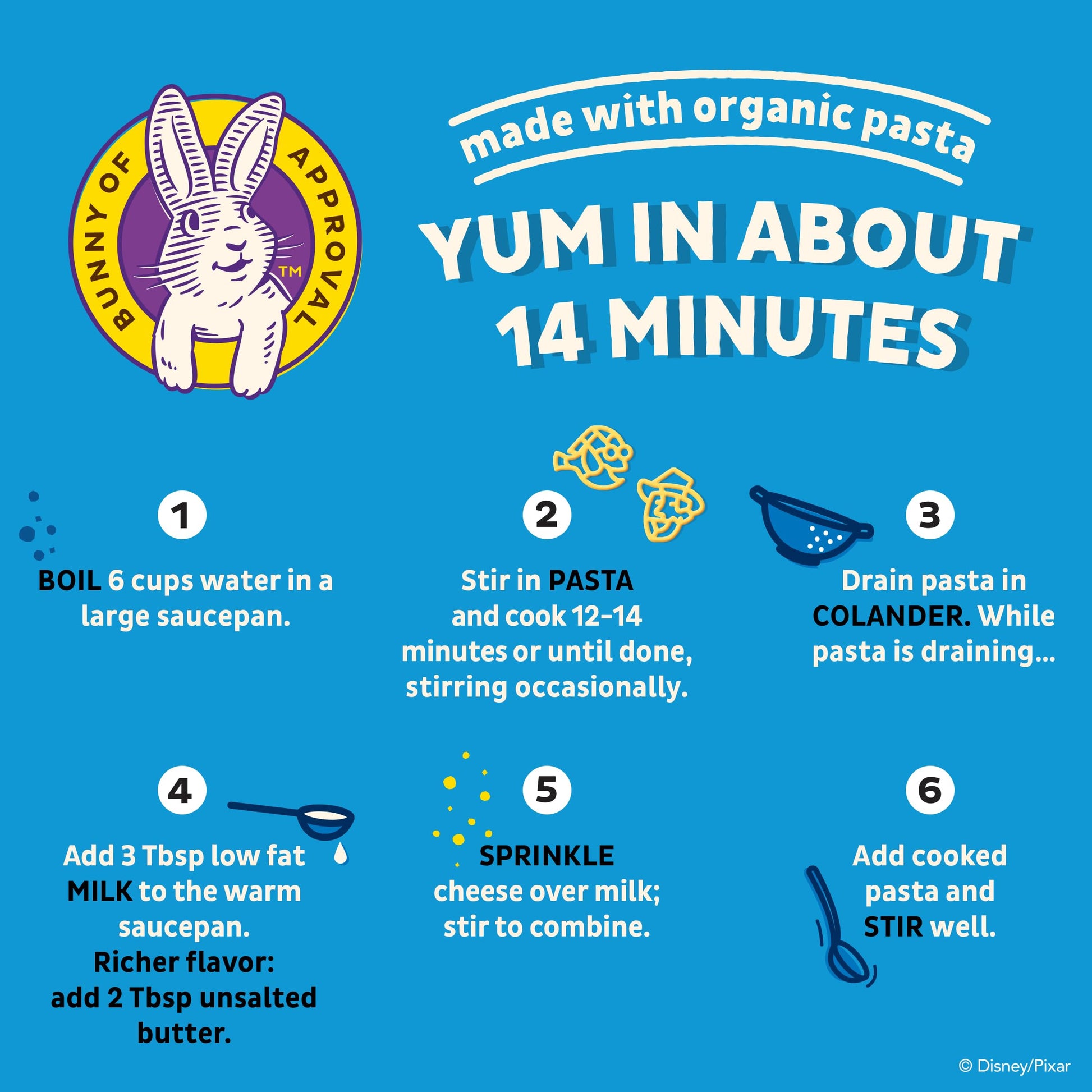 Q: How do you prepare Annie's Disney mac and cheese?A: To prepare Annie's Disney mac and cheese, simply boil water, add the fun-shaped pasta, and cook for 12 to 14 minutes. After draining, stir in low-fat milk and the included cheese for a delicious meal.