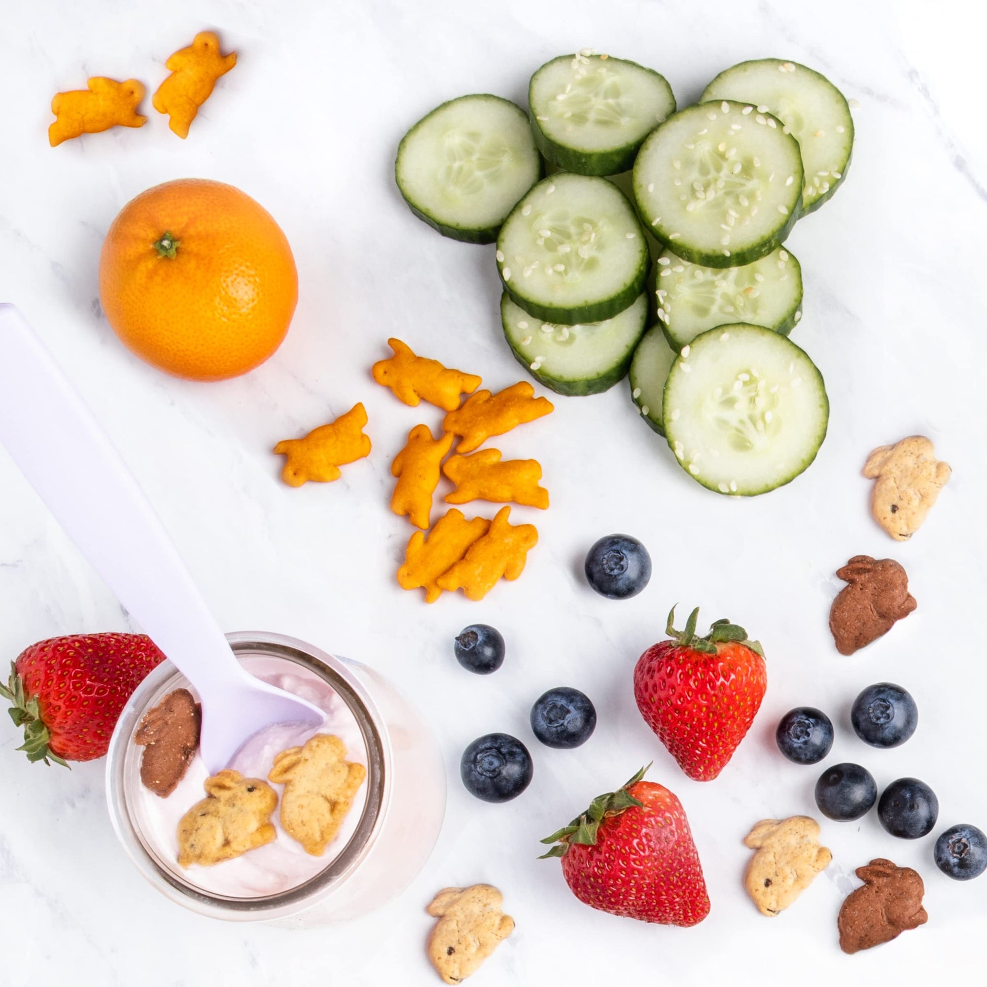 Q: How many snacks are included in the variety pack?A: The variety pack contains a total of 36 pouches, which includes 18 Cheddar Bunnies and 18 Bunny Grahams, each pouch weighing 1 oz.