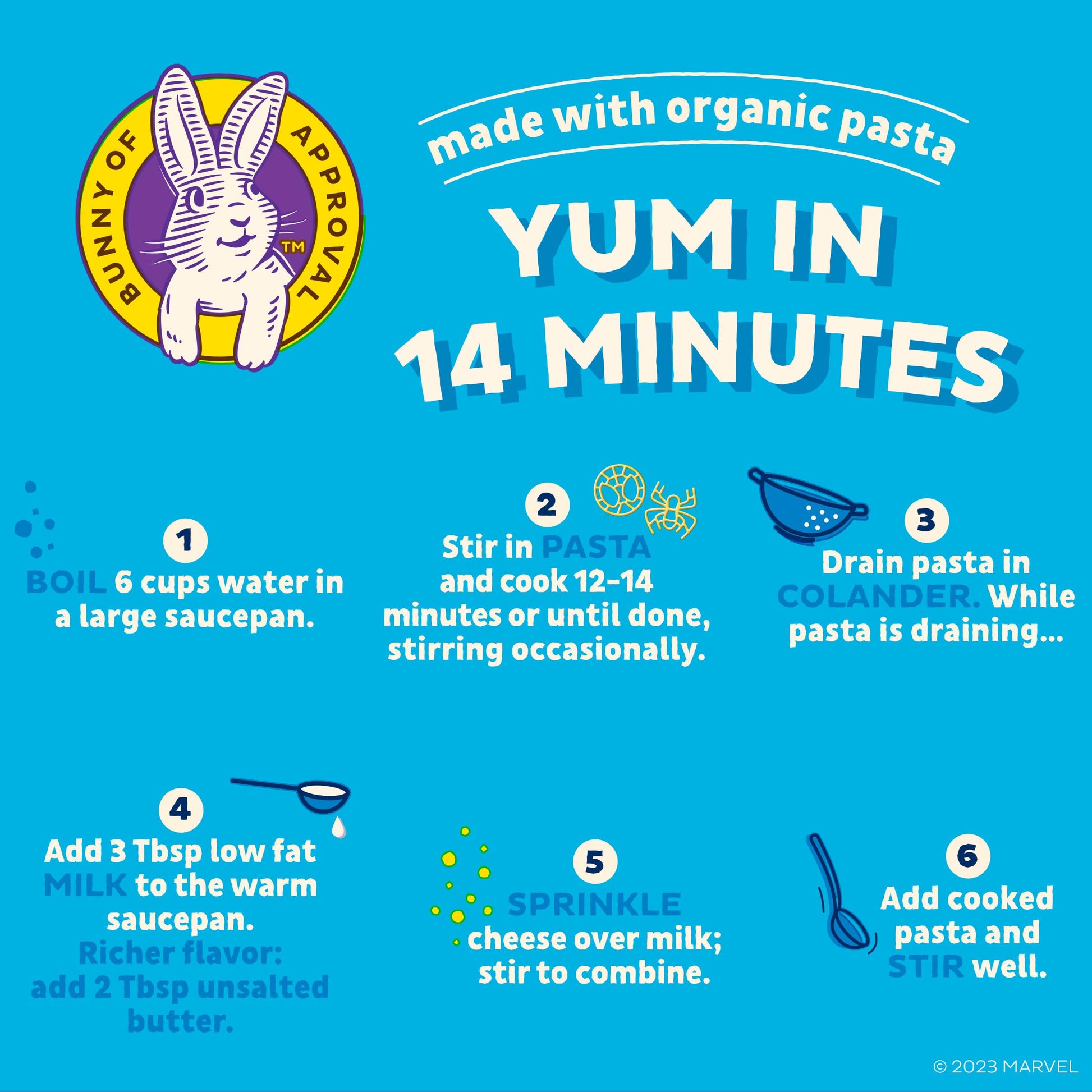 Q: How long does it take to prepare Annie's Spidey Mac and Cheese?A: Preparation is quick and easy, taking about 14 minutes to have a tasty meal ready, perfect for busy families.