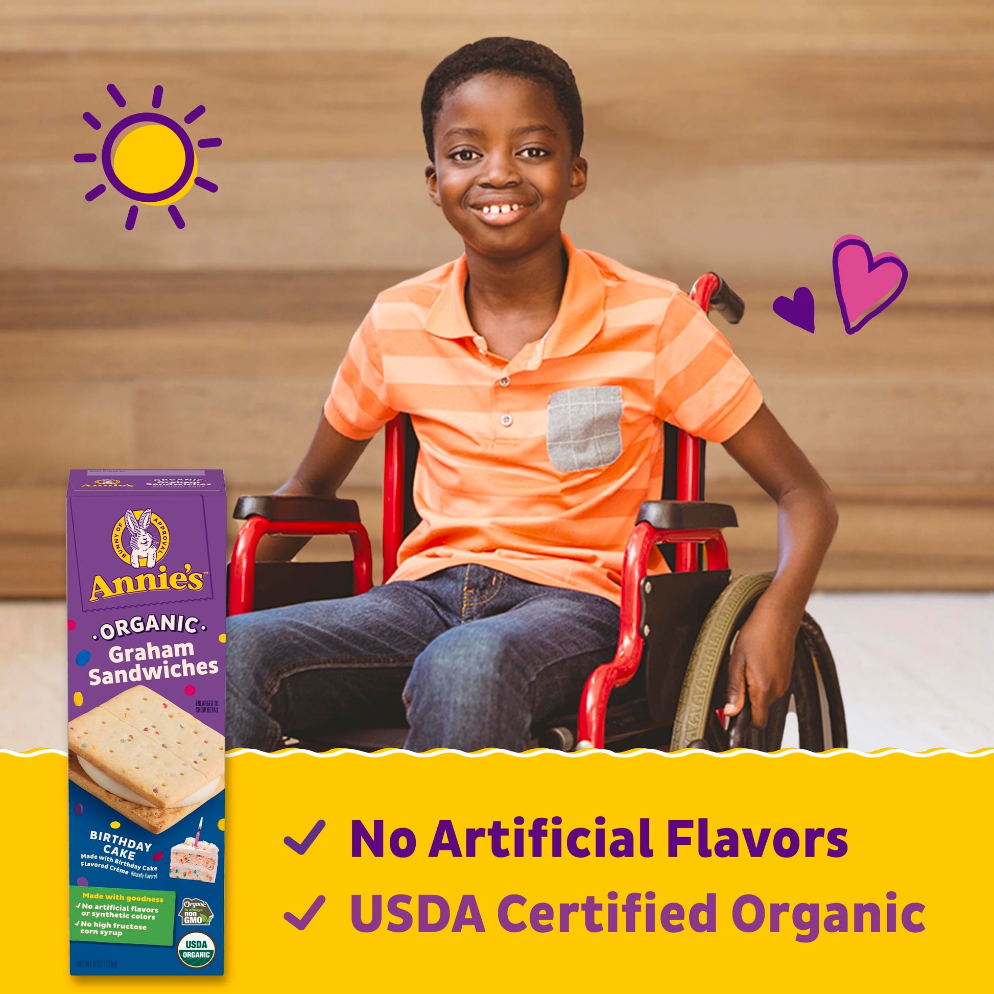 When you need a sweet snackity snack, grab a package of Annies Organic B-Day Cake Graham Sandwiches. These sweet non-GMO treats are crafted with organic graham crackers loaded with sprinkles and birthday cake-flavored creme, ideal for an afternoon sweet tooth craving. There are no artificial flavors or synthetic colors, and no high fructose corn syrup. Perfect for busy bunnies, pack these birthday cake-flavored snacks in a lunchbox or backpack for on-the-go enjoyment, or simply keep a package in the pantry for snack time, any time. Annies makes products in over 20 family-friendly categories, from fruit flavored snacks and cereal to mac and cheese. For busy bunnies and families on the go, we help make life a little easier and more delicious by spreading goodness through tasty foods and kindness to the planet.