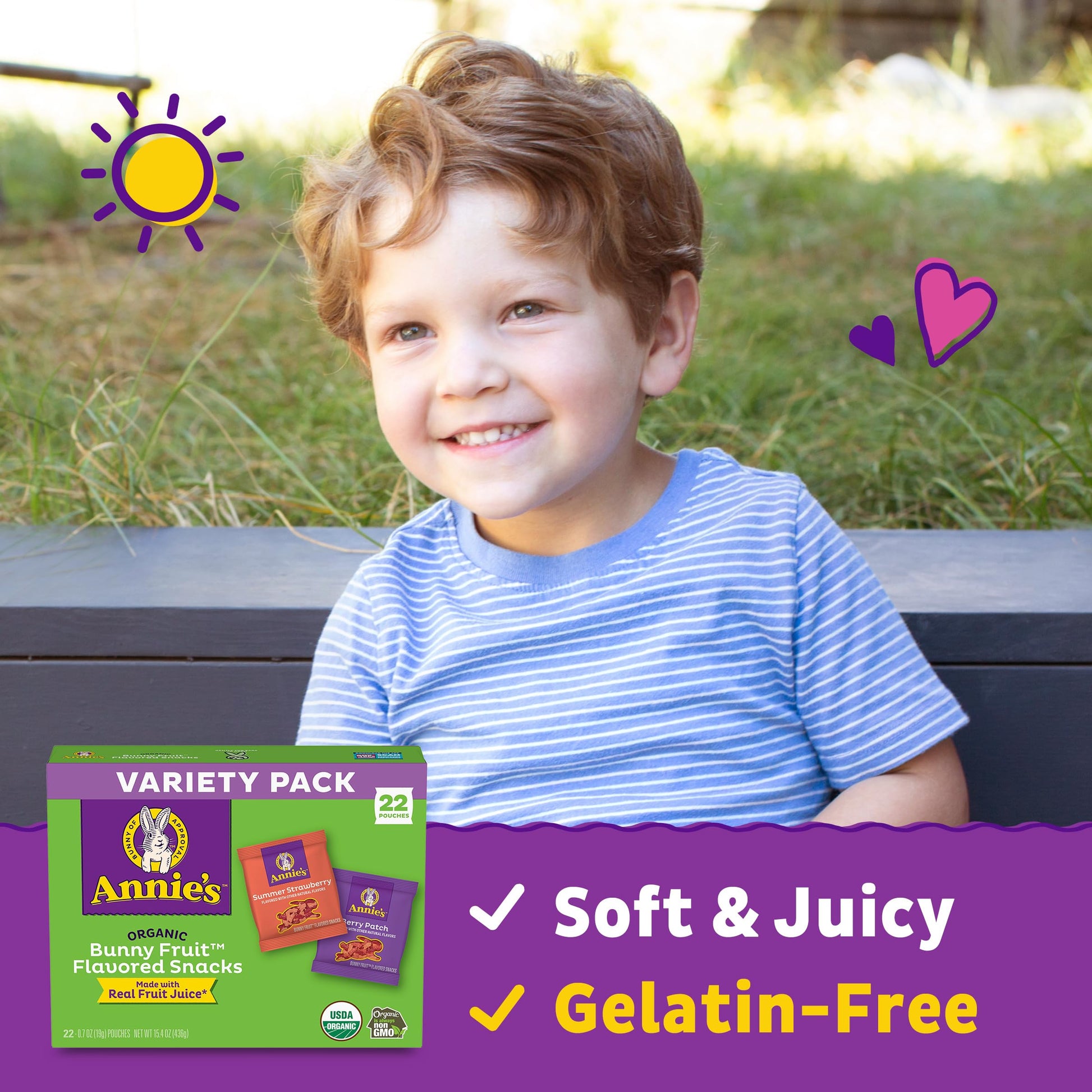 This is a variety pack of Summer Strawberry fruit snacks, enlivened with the taste of juicy strawberries and Organic Berry Patch Bunny Fruit Snacks, that are a delicious mix of strawberry, cherry and raspberry flavored bunnies. Certified organic, these vegan and gluten-free bunny-shaped fruit snacks are made with real fruit juice and packed with vitamin C.