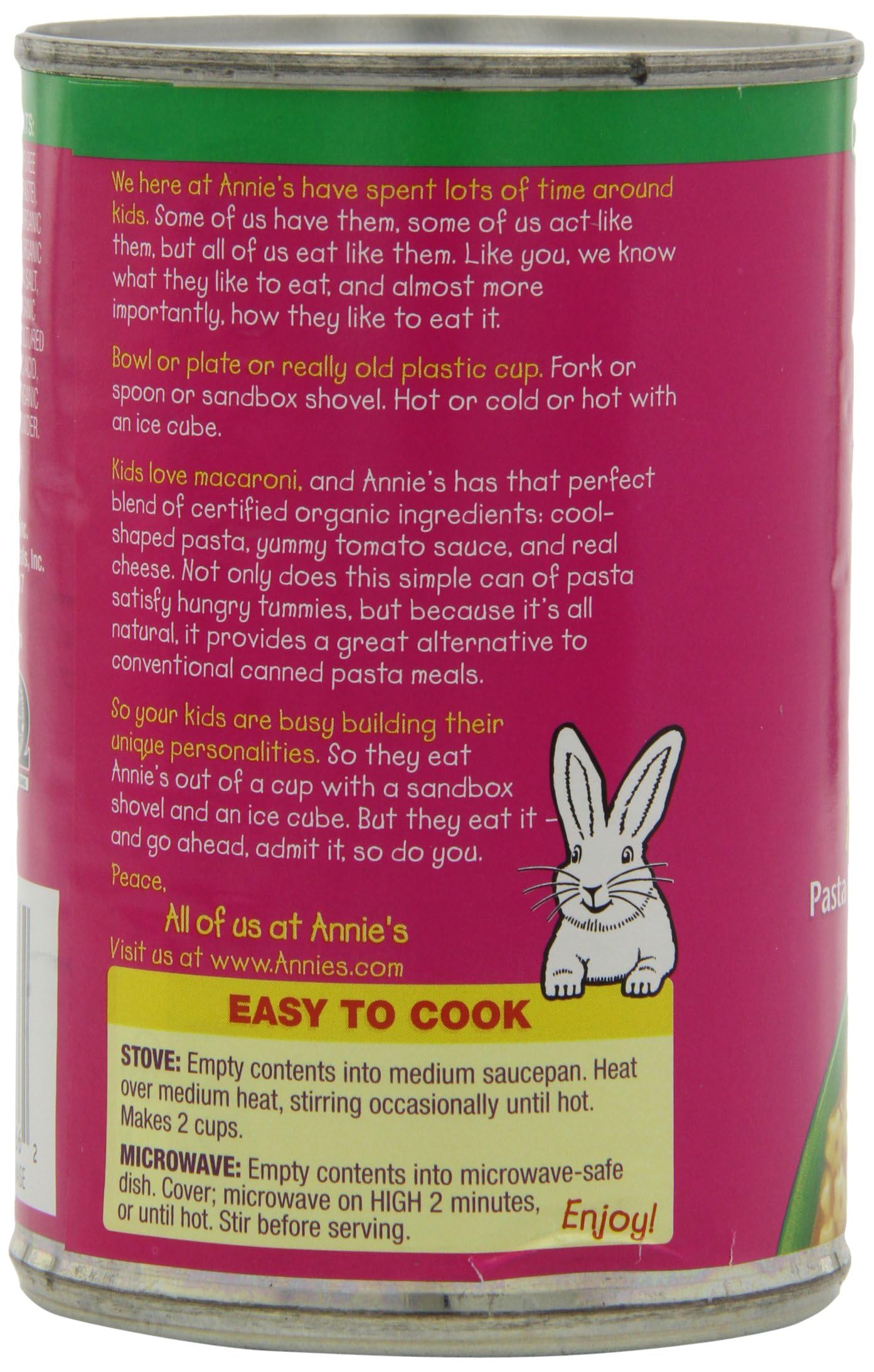 - Q: Can I heat this pasta on the stove or in the microwave? A: Yes, Annie's Organic Canned Pasta can be heated on the stove or in the microwave. For stovetop preparation, empty the contents of the can into a saucepan and heat until warm. For microwave heating, transfer the pasta to a microwave-safe bowl and heat in increments, stirring in between.