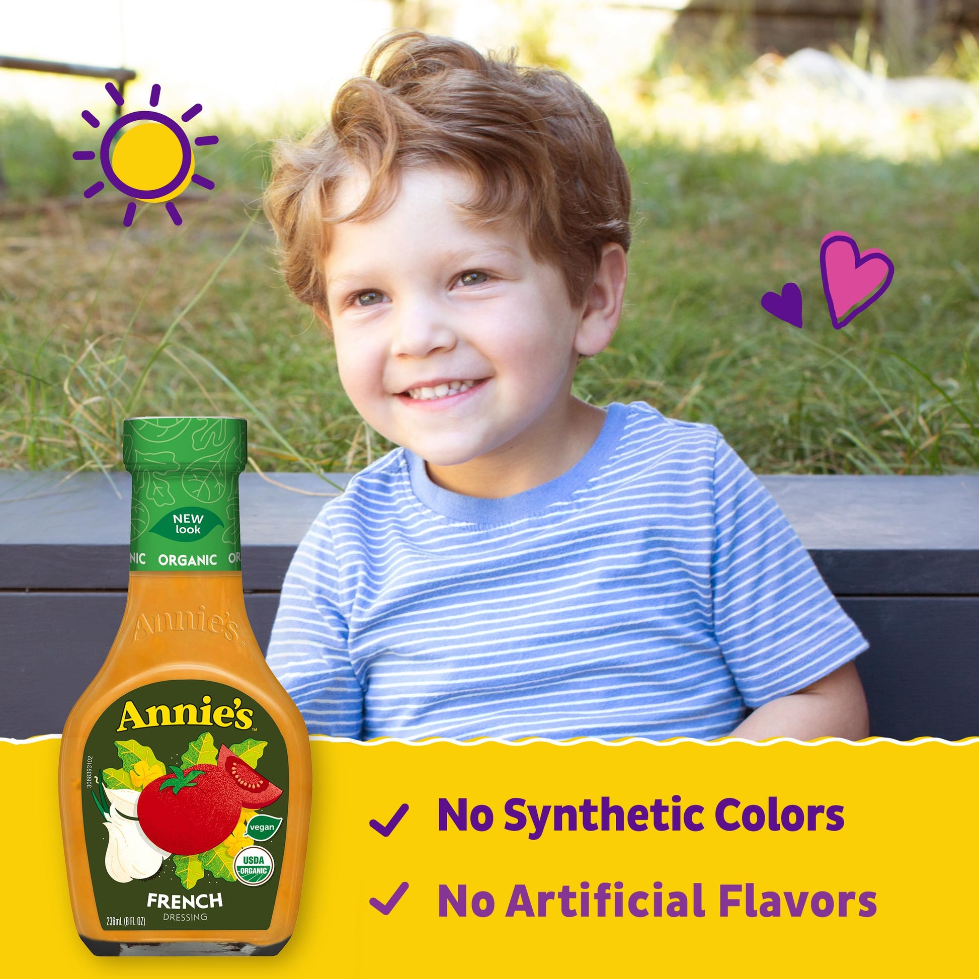 Product Descriptionbrighten Up Salads And Recipes With Delicious Annie'S French Salad Dressing. Bursting With Flavor And Tangy Tastes, This Certified Usda Organic Salad Dressing Is Vegan, Non-Gmo, And Has 110 Calories Per Serving. We Make Our French Dressing With Just The Good Stuff - No Artificial Flavors Or Synthetic Colors, Using Expeller Pressed Oil. Top Your Favorite Mixed Green Salad, Use As Veggie Dip, Or Mix Into A Tasty Casserole Recipe. This Salad Dressing Is Great To Have On Hand For A Quick Addition To A Healthy Lunch. Try All Of Annie'S Salad Dressings, Made With Quality Ingredients. Annie'S Makes Products In Over 20 Family-Friendly Categories, From Fruit Flavored Snacks And Cereal To Mac And Cheese. For Busy Bunnies And Families On The Go, We Help Make Life A Little Easier And More Delicious By Spreading Goodness Through Tasty Foods And Kindness To The Planet.Annie Withey Believed It Was Possible To Build A Socially Conscious & Successful Business. This Was Her Mission In 1989 When She Wrote Her Name, Address, And Phone Number On The Very First Boxes Of Annies Mac & Cheese. Her Legacy Lives On As Annies Strives To Change The Future For Our Kids, Starting With Food. Annies, Now Based In Berkeley, Ca, Believes That Food Is The Most Powerful Force For Change We Have, And That Each Generation Owes It To The Next To Leave The Planet Better Than We Found It. This Is Why They Make Their Products With Integrity, Invest In Organic And Regenerative Farming Practices, And Always Consider People, Planet, And Their Bunny Footprint With All That They Do. Best Known For Their Delicious Mac & Cheese And Bunny-Shaped Snacks, Annies Makes Yummy Products In Over 20 Family-Friendly Categories - Spanning From Fruit Snacks To Cereal To Bars, Plus A Variety Of Gluten-Free And Vegan Products For Their Friends With Special Diets. But Annies Is Truly More Than Just Food. Annies Is A Purpose Driven Brand Who Believes That Together, We Can Leave Behind A Healthier Planet For Our Kids.Annie Withey Believed It Was Possible To Build A Socially Conscious & Successful Business. This Was Her Mission In 1989 When She Wrote Her Name, Address, And Phone Number On The Very First Boxes Of Annies Mac & Cheese. Her Legacy Lives On As Annies Strives To Change The Future For Our Kids, Starting With Food. Annies, Now Based In Berkeley, Ca, Believes That Food Is The Most Powerful Force For Change We Have, And That Each Generation Owes It To The Next To Leave The Planet Better Than We Found It. This Is Why They Make Their Products With Integrity, Invest In Organic And Regenerative Farming Practices, And Always Consider People, Planet, And Their Bunny Footprint With All That They Do. Best Known For Their Delicious Mac & Cheese And Bunny-Shaped Snacks, Annies Makes Yummy Products In Over 20 Family-Friendly Categories - Spanning From Fruit Snacks To Cereal To Bars, Plus A Variety Of Gluten-Free And Vegan Products For Their Friends With Special Diets. But Annies Is Truly More Than Just Food. Annies Is A Purpose Driven Brand Who Believes That Together, We Can Leave Behind A Healthier Planet For Our Kids.
