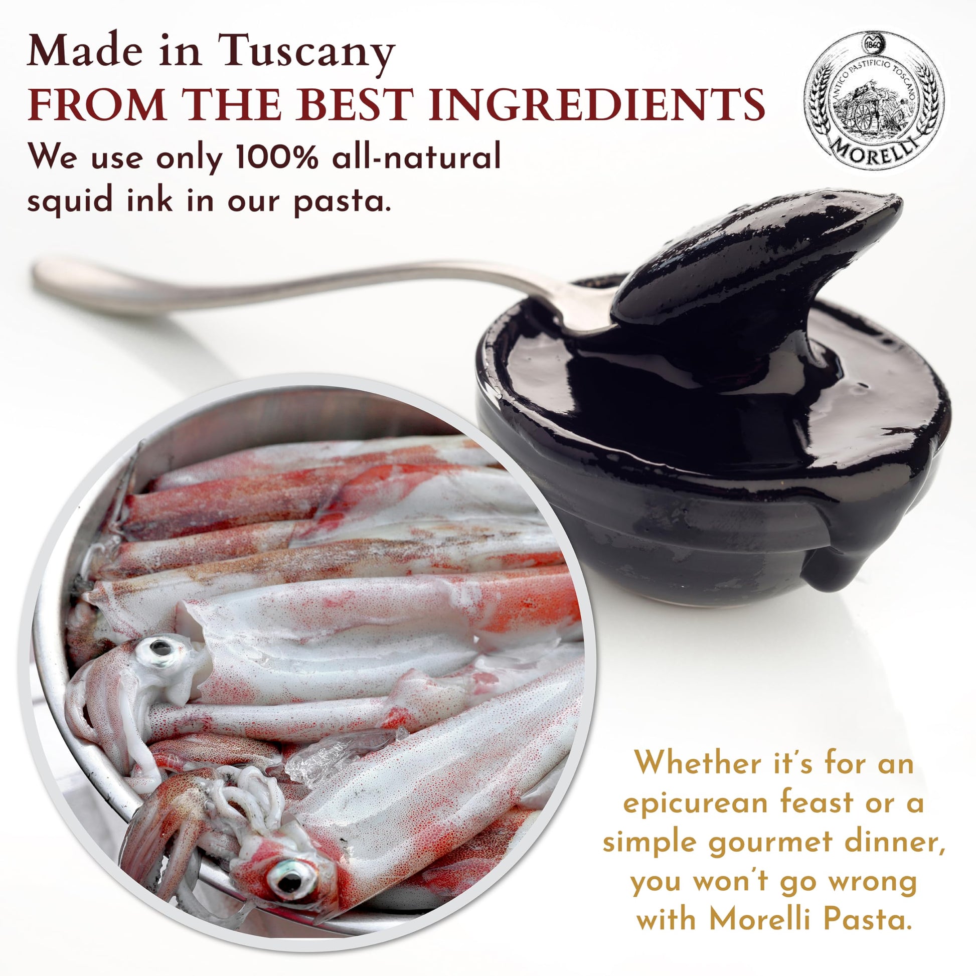 - Q: What is Morelli Squid Ink Pasta made from? A: Morelli Squid Ink Pasta is made from durum wheat semolina and black squid ink, which gives it a unique flavor and color. The use of wheat germ enhances its nutritional profile.