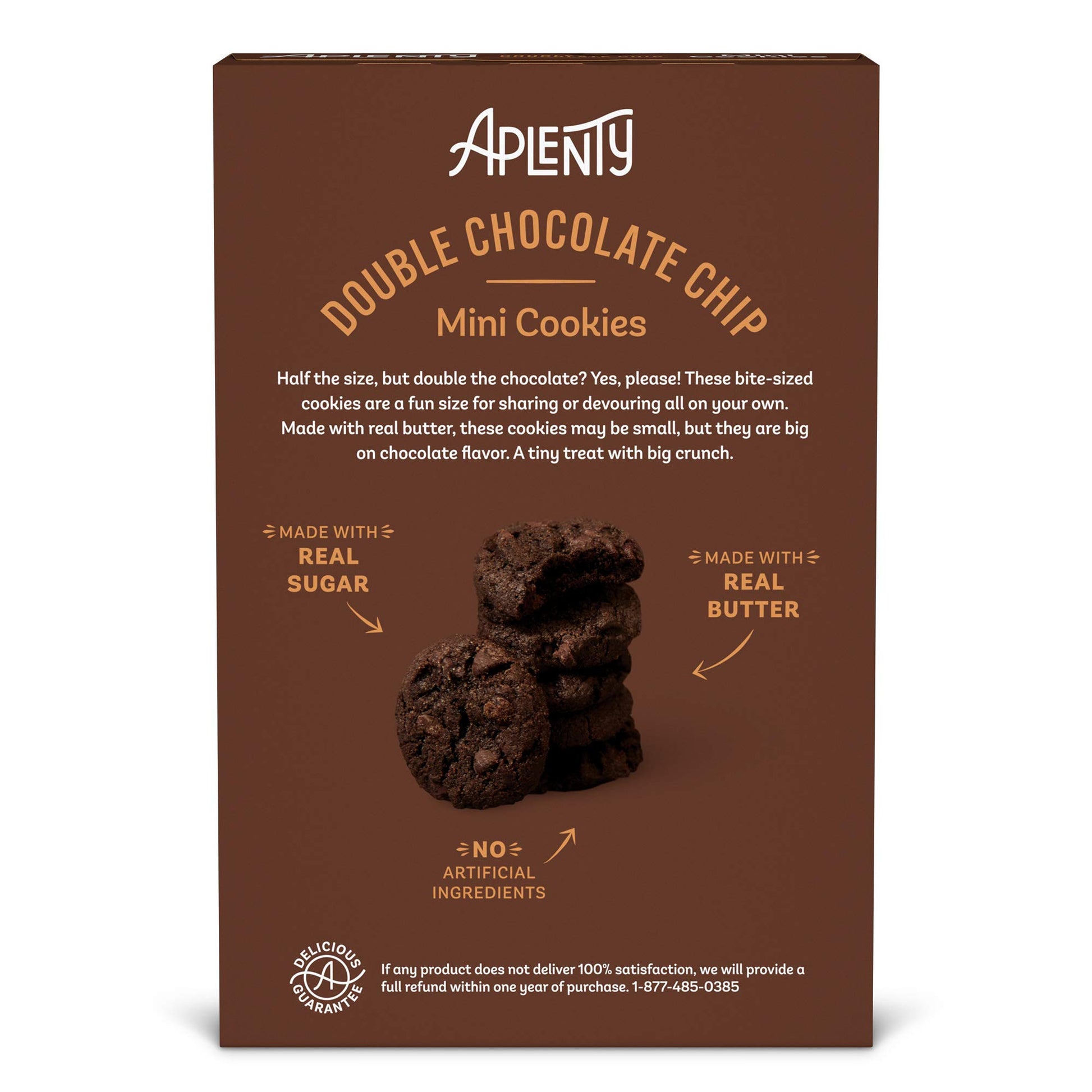 - Q: What makes Aplenty Double Chocolate Chip Mini Cookies unique? A: Aplenty Double Chocolate Chip Mini Cookies are unique due to their bite-sized format, which makes them perfect for sharing or enjoying individually. They are made with real butter and sugar, resulting in a rich chocolate flavor and satisfying crunch.