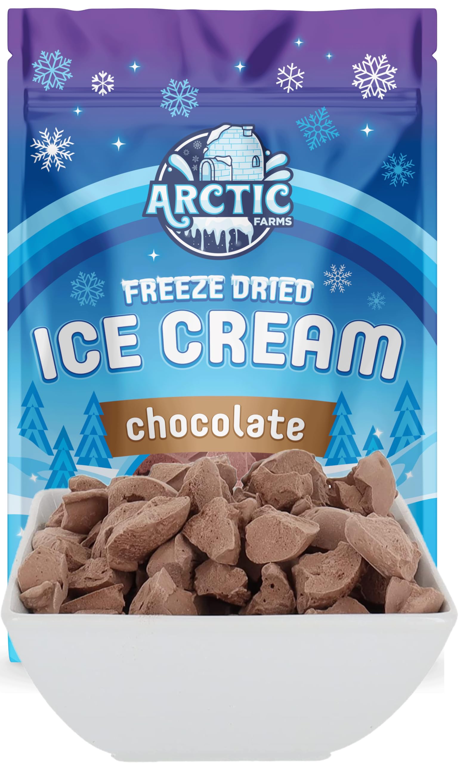Q: What are Arctic Farms Freeze Dried Ice Cream Bits made of?A: Arctic Farms Freeze Dried Ice Cream Bits are made from high-quality chocolate ice cream that has undergone a freeze-drying process, preserving the flavor and texture while ensuring they won't melt.