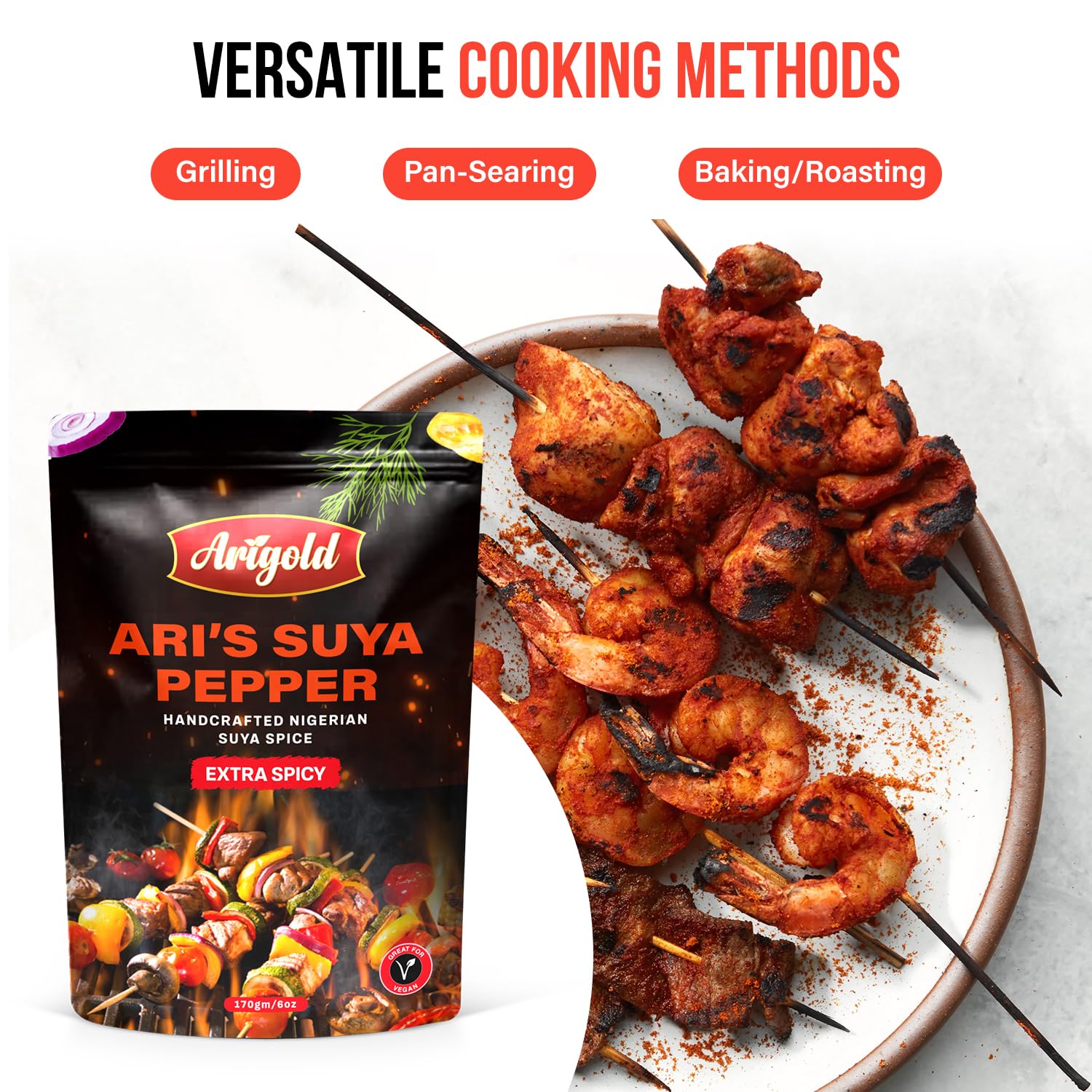- Q: What is Arigold Suya Pepper and what are its main ingredients? A: Arigold Suya Pepper is a handcrafted Nigerian suya spice that adds bold and authentic West African flavors to your dishes. Its main ingredients include chili, ginger, garlic, nutmeg, and paprika.