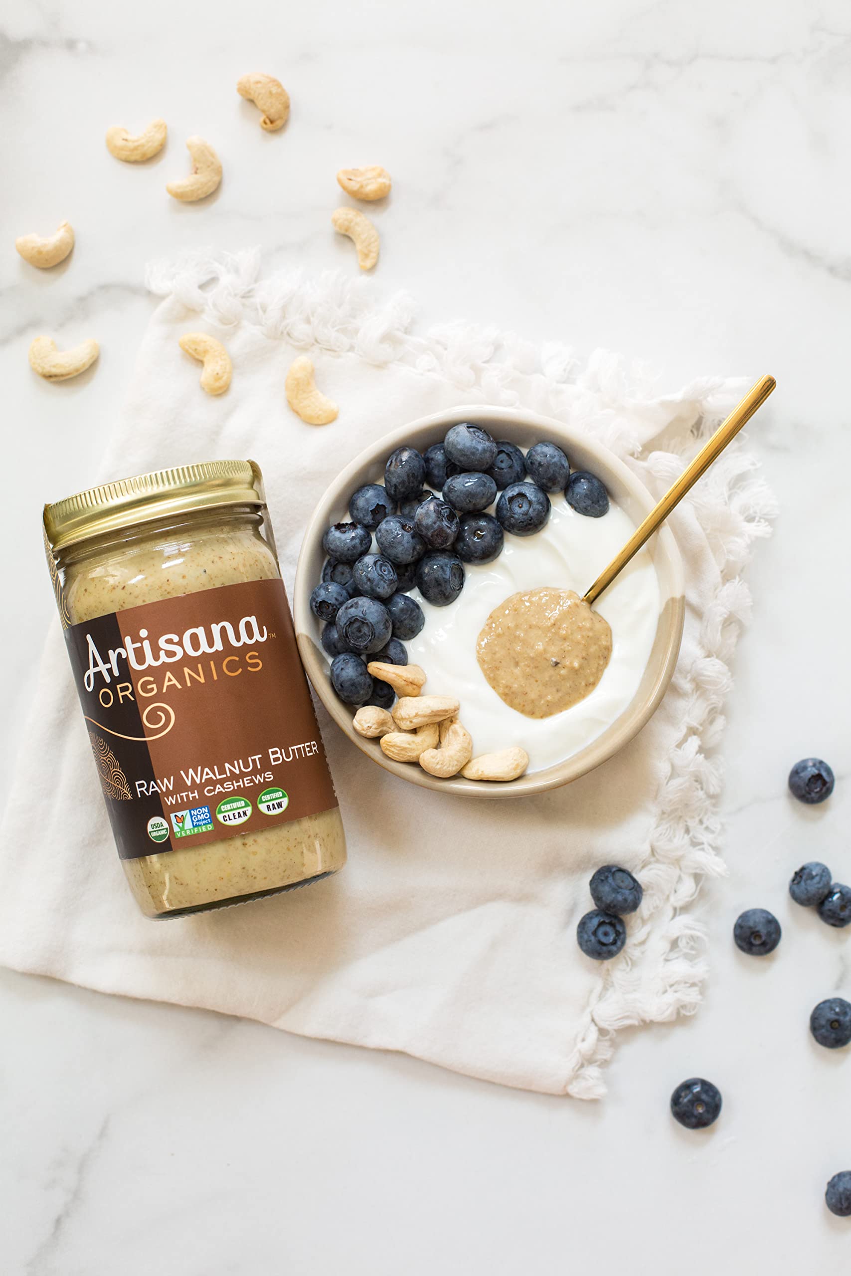 Q: What are the main ingredients in Artisana Organics Raw Walnut Butter with Cashews?A: Artisana Organics Raw Walnut Butter contains only two ingredients: 100% organic, raw walnuts and cashews. There are no additives or palm oil.