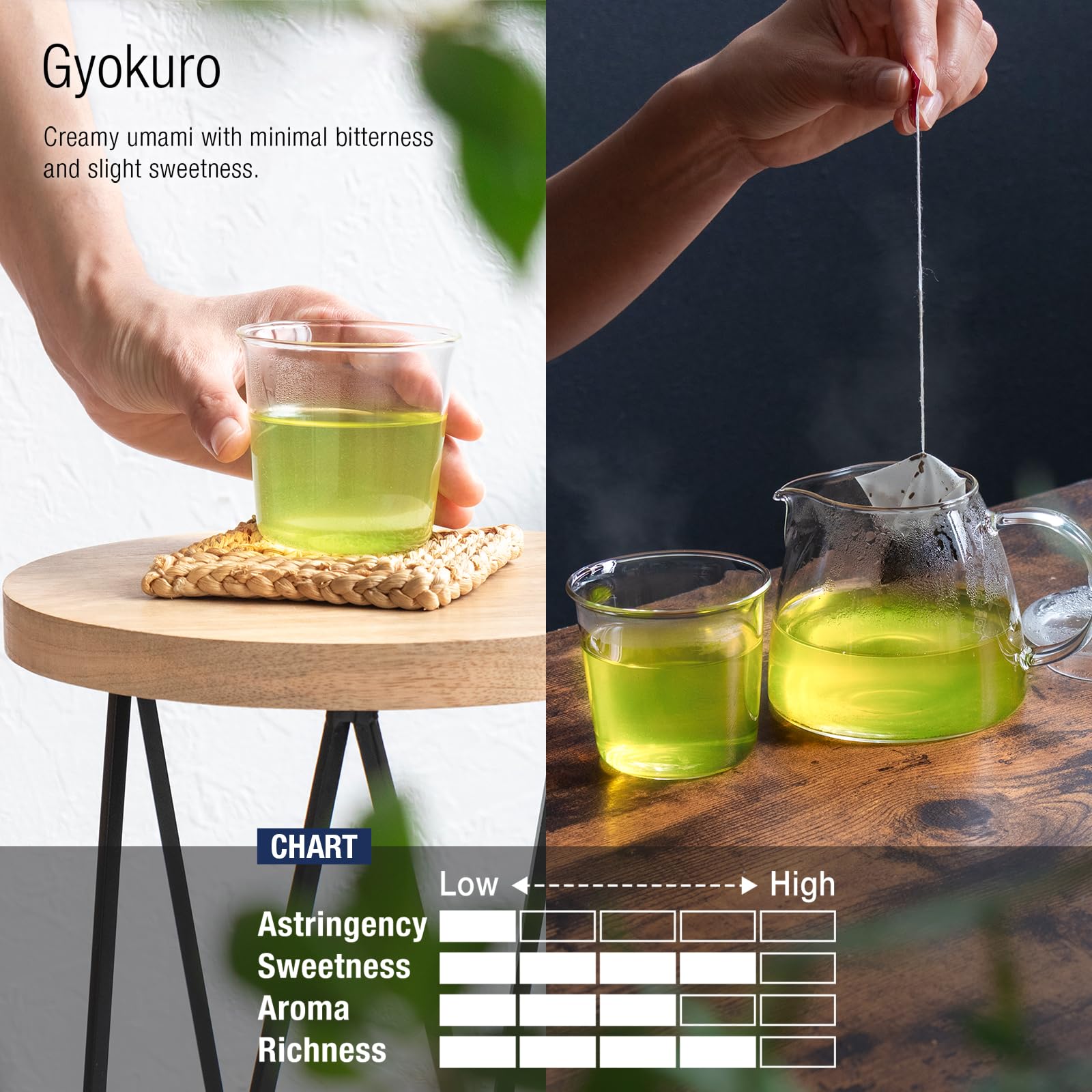 - Q: How do I brew Gyokuro tea using the tea bags? A: To brew Gyokuro tea, pour 8 fl oz (240mL) of hot water at 60°C (140°F) into a teacup. Add one tea bag, stir gently to adjust the flavor, and let it steep for 3 minutes before removing the tea bag for the perfect infusion.