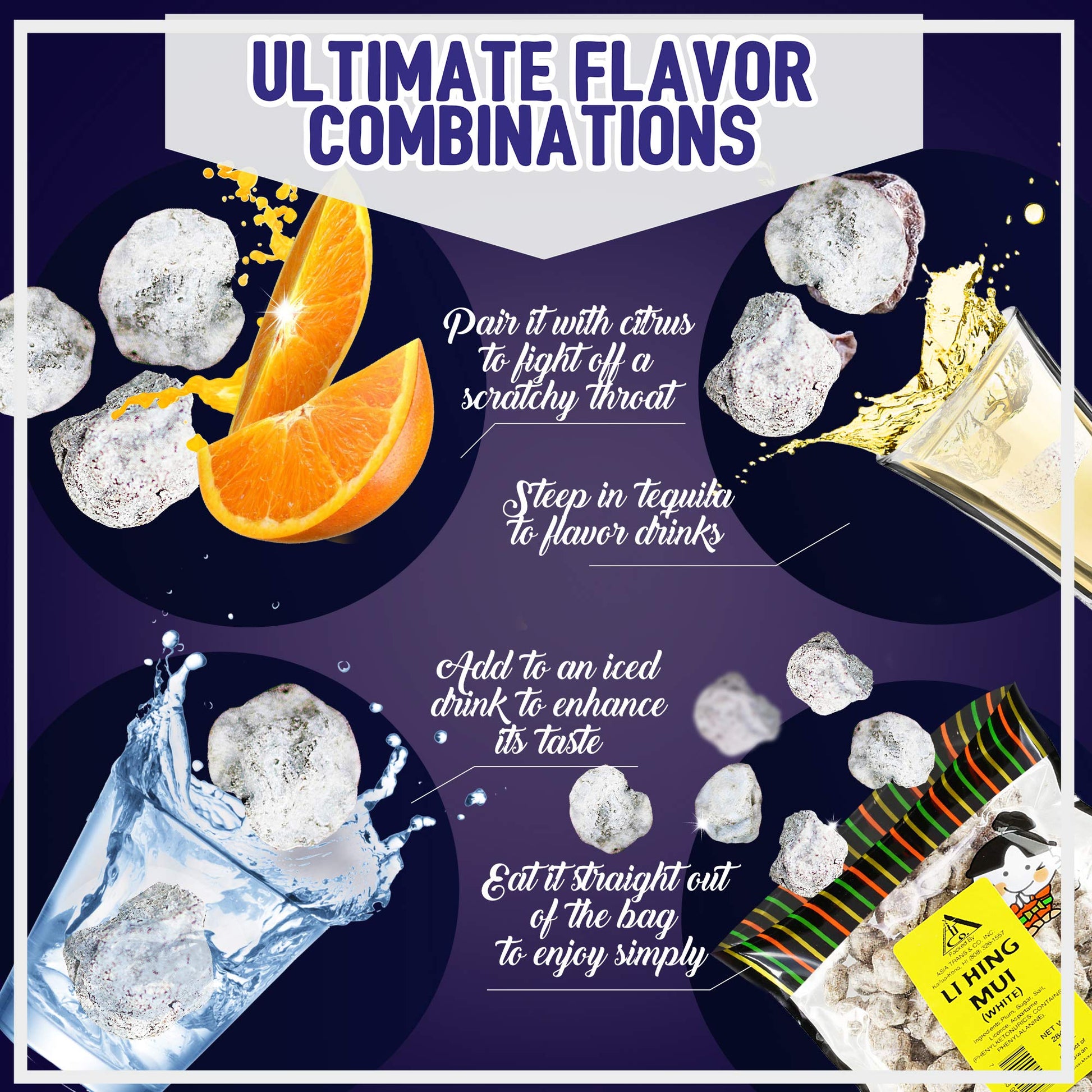- Q: How should I consume Li Hing Mui plums? A: Li Hing Mui plums can be enjoyed straight out of the bag, as a flavoring for alcoholic beverages, or sprinkled over fresh fruits like pineapple for added zest.