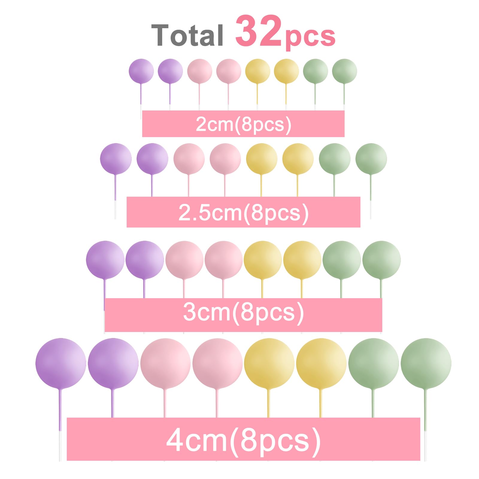 • Q: What sizes are included in the 32-piece cake topper set? A: The 32-piece cake topper set includes four different sizes: 0.79 inch (2 cm), 0.98 inch (2.5 cm), 1.18 inch (3 cm), and 1.57 inch (4 cm), with 8 pieces of each size.