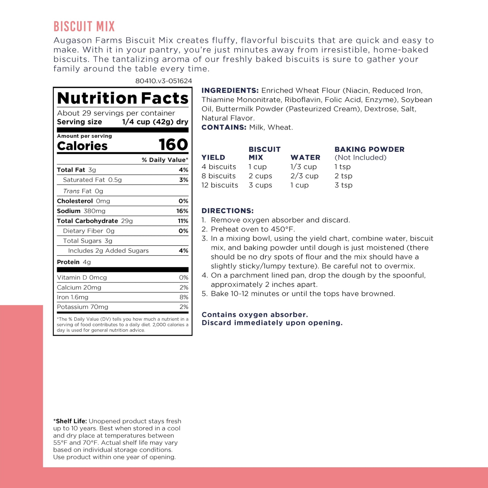 Q: What are the key ingredients in Augason Farms Biscuit Mix?A: Augason Farms Biscuit Mix is made from top-quality all-natural ingredients, specifically blended for creating flaky biscuits and other delicious baked goods.