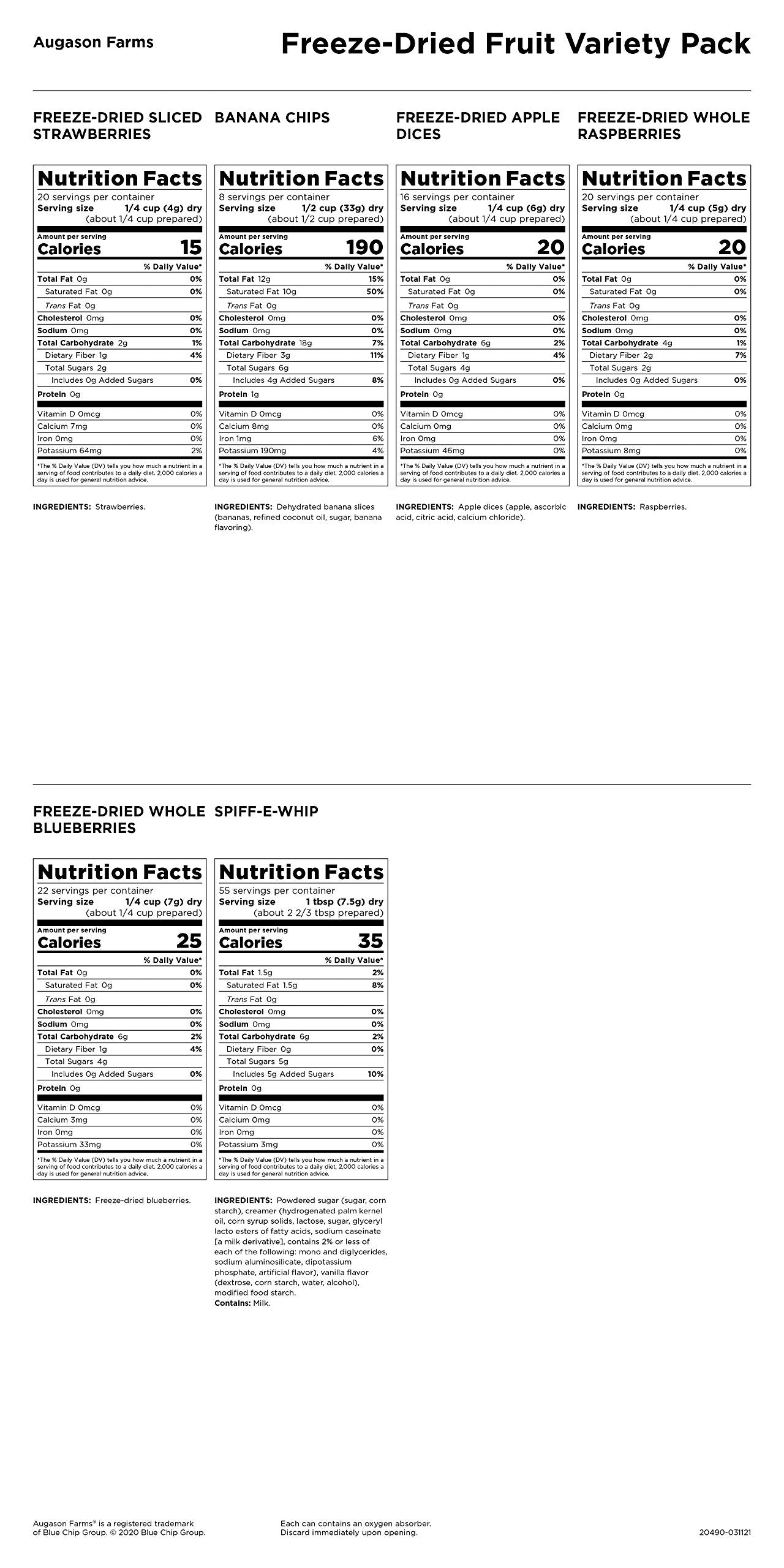 - Q: What types of fruits are included in the Augason Farms Fruit Variety Pail? A: The Augason Farms Fruit Variety Pail includes a selection of freeze-dried fruits such as sliced strawberries, apple dices, whole raspberries, whole blueberries, and dehydrated banana chips, along with a Spiff-E-Whip Dessert Topping Mix and a recipe booklet.