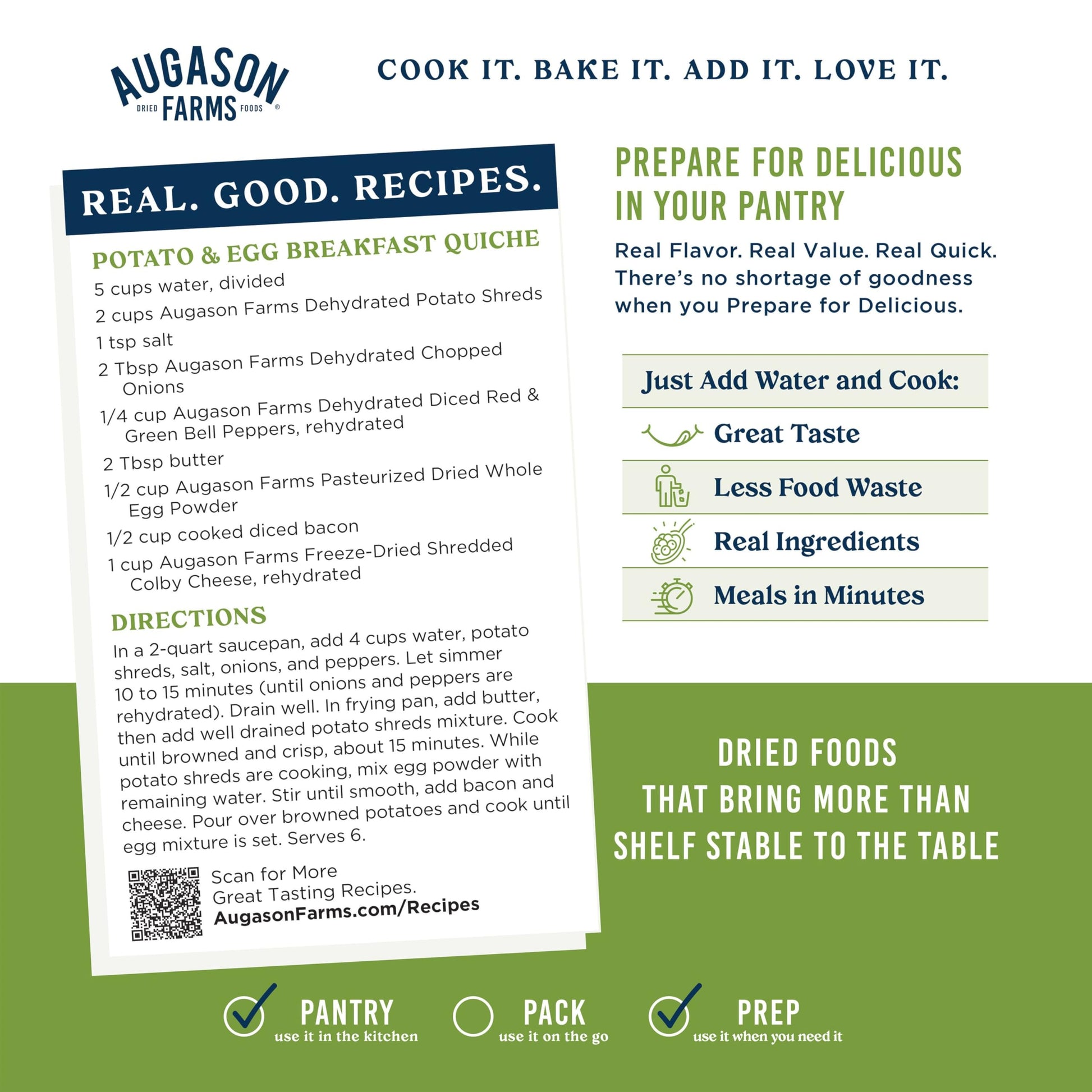 Q: Can I combine Augason Farms Dehydrated Potato Shreds with other dehydrated foods?A: Absolutely! These potato shreds pair well with other Augason Farms dehydrated vegetables and freeze-dried meats, enhancing the flavor and nutritional value of your dishes.