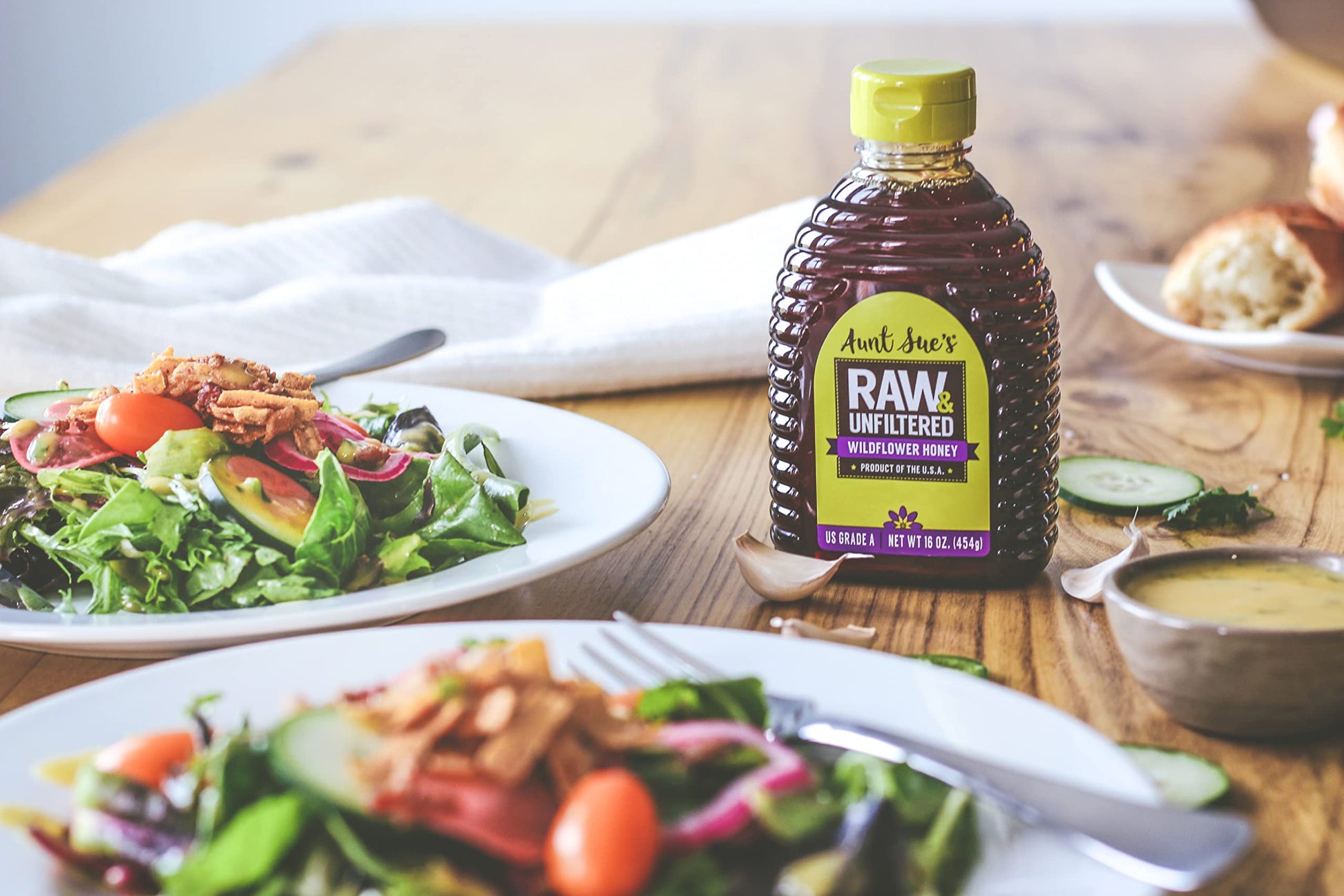 • Q: What makes Aunt Sue’s Raw & Unfiltered Wildflower Honey different from regular honey? A: Aunt Sue’s Raw & Unfiltered Wildflower Honey is minimally processed and not filtered, which allows it to retain more natural pollen. This results in a bolder flavor and preserves the health benefits associated with raw honey.