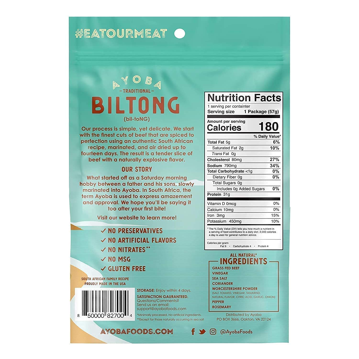 Introducing Ayoba'S Beef Biltong Jerky, The Fresh Alternative To Traditional Jerky Snacks. Made From 100% Grass-Fed Beef, Our Biltong Is Hand-Dried For Fourteen Days, Resulting In Naturally Tender, Moist Slices That Are Easy To Chew. Ayoba'S Biltong Is A Flavor Sensation That Will Leave You Craving More. Not Only Does Our Biltong Satisfy Your Taste Buds, But It Also Fuels Your Active Lifestyle With Its Energizing Protein-Packed Goodness. Say Goodbye To Protein Shakes And Hello To Our Biltong, Which Boasts An Impressive 31G Of High-Quality Protein Per Pack. Whether You Need A Boost For Your Workout Or A Protein-Rich Snack To Fuel Your Day, Ayoba Has You Covered. Indulge Guilt-Free In Our Biltong, Crafted From An Exclusive Family Recipe That Is Sugar-Free And Gluten-Free. Experience The Robust Flavors Of Our Biltong Spice Without Worrying About Sugar Rushes Or Compromising Your Healthy Eating Habits. Elevate Your Snacking Game With These Incredibly Delicious Meat Snacks. Wherever Your Journey Takes You, Ayoba'S Traditional Biltong Is The Perfect Companion. Our Biltong Is Not Only Delicious, But It Is Also Keto-Friendly, Paleo-Friendly, And Aligned With The Principles Of The Whole 30 Diet. Free From Any Artificial Ingredients Or Nitrates, These Treats Are The Ideal Choice For Those Following Low-Carb Diets. With Ayoba'S Biltong, You Can Indulge In Guilt-Free Snacking While Nourishing Your Body! Experience The Pure Essence Of Natural Beef Flavor With Our Biltong. Unlike Alternatives That Overpower With Barbecue Or Teriyaki Sauces, Our Biltong Allows You To Relish The True Taste Of Your Favorite Cut Of Steak. Conveniently Packaged In To-Go Bags, Ayoba'S Biltong Delivers A Mouthwatering Satisfaction Wherever You Are. Enjoy The Rich And Robust Taste Of Premium Beef In Every Bite! Try Ayoba'S Beef Biltong Jerky Today And Treat Yourself To A Tantalizing Snacking Experience That Combines Unmatched Flavor, High Protein Content, And A Commitment To Your Health And Well-
