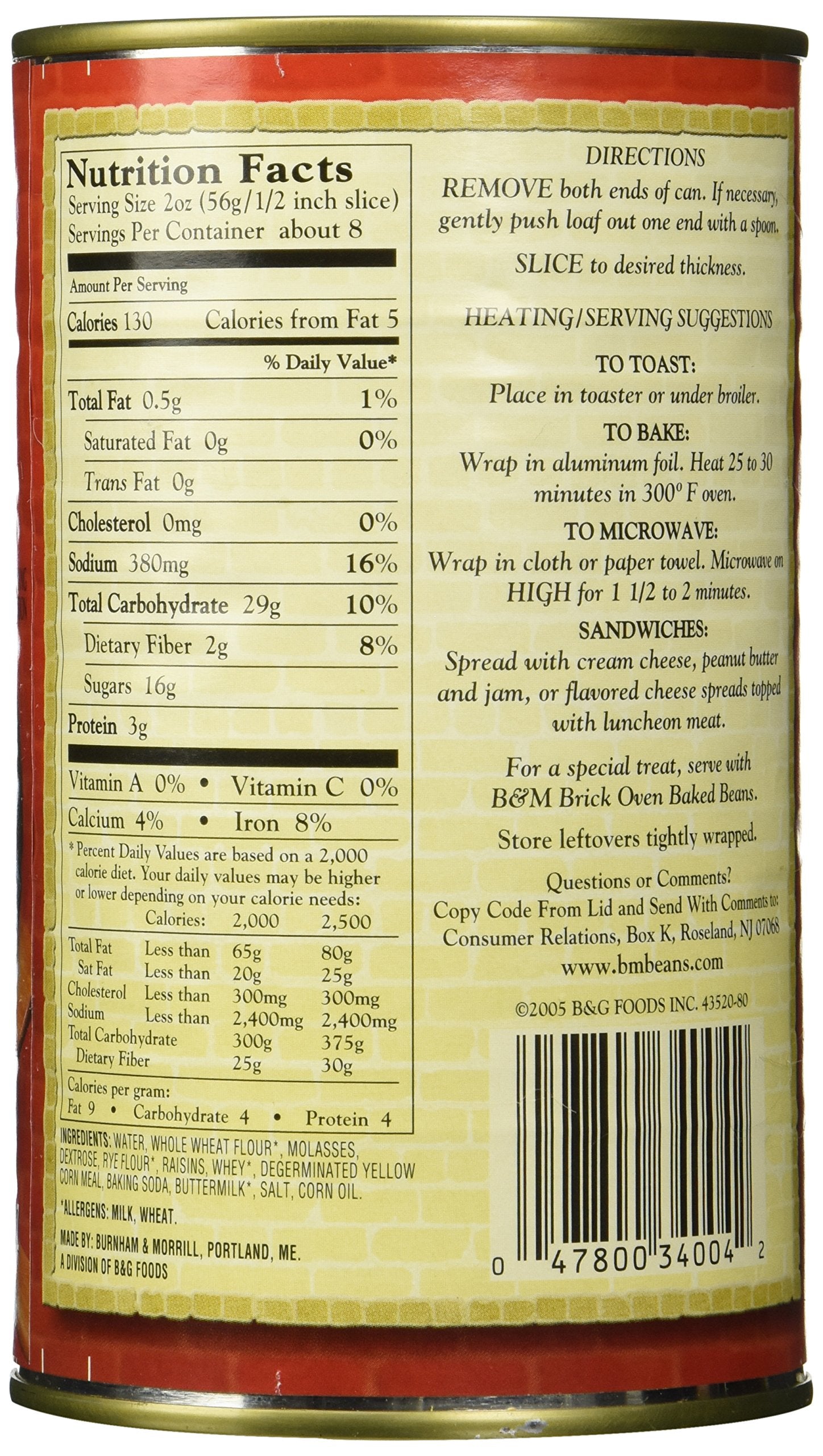 Brown Bread with Raisins made with Water, Whole Wheat Flour Salt and Corn Oil. It is a New England's finest product. 99 percent Fat free. No cholesterol. Available in Pack of six, 16-ounce (total of 96 ounces).
